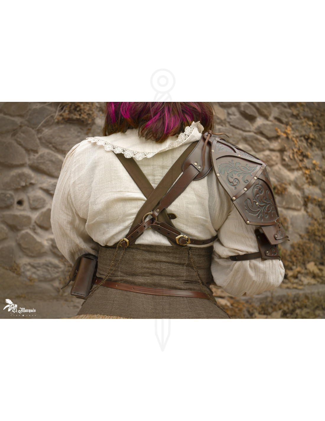 Med et design, der inkluderer nitter og messing spænder med en gammel guldbelægning, er hver detalje nøje gennemarbejdet for at give en imponerende finish. Denne skulderbeskytter er ikke bare et plagg; det er et vidnesbyrd om håndværk, designet til dem, der værdsætter distinction og ønsker at skille sig ud i enhver anledning.