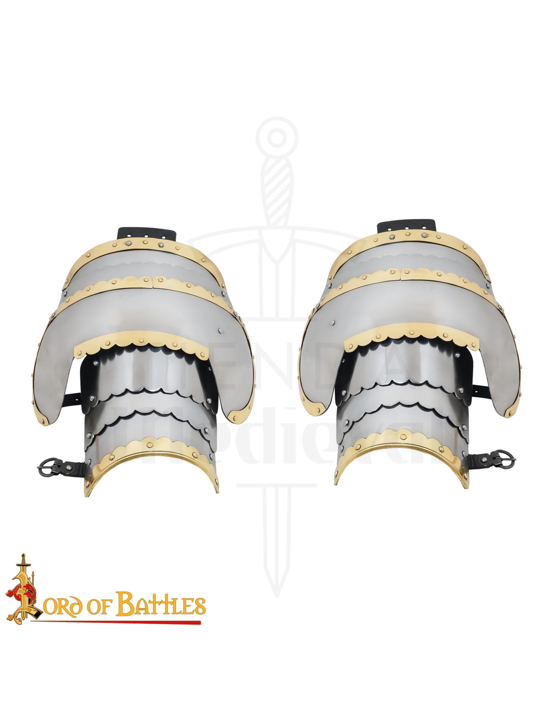 Deres ledede design, inspireret af 1500-tallets Hussar-rustning, giver fuld dækning med overlappende plader, der effektivt beskytter skuldrene. Med en vægt på omkring 4,45 kg for et par er de lette for effektiv beskyttelse og nemme at bruge i flere timer. Håndværket og den detaljerede finish, der fremhæver gyldne nagler og scalloped kanter i designet, vil gøre dit kostume til et ægte stykke historie og stil.