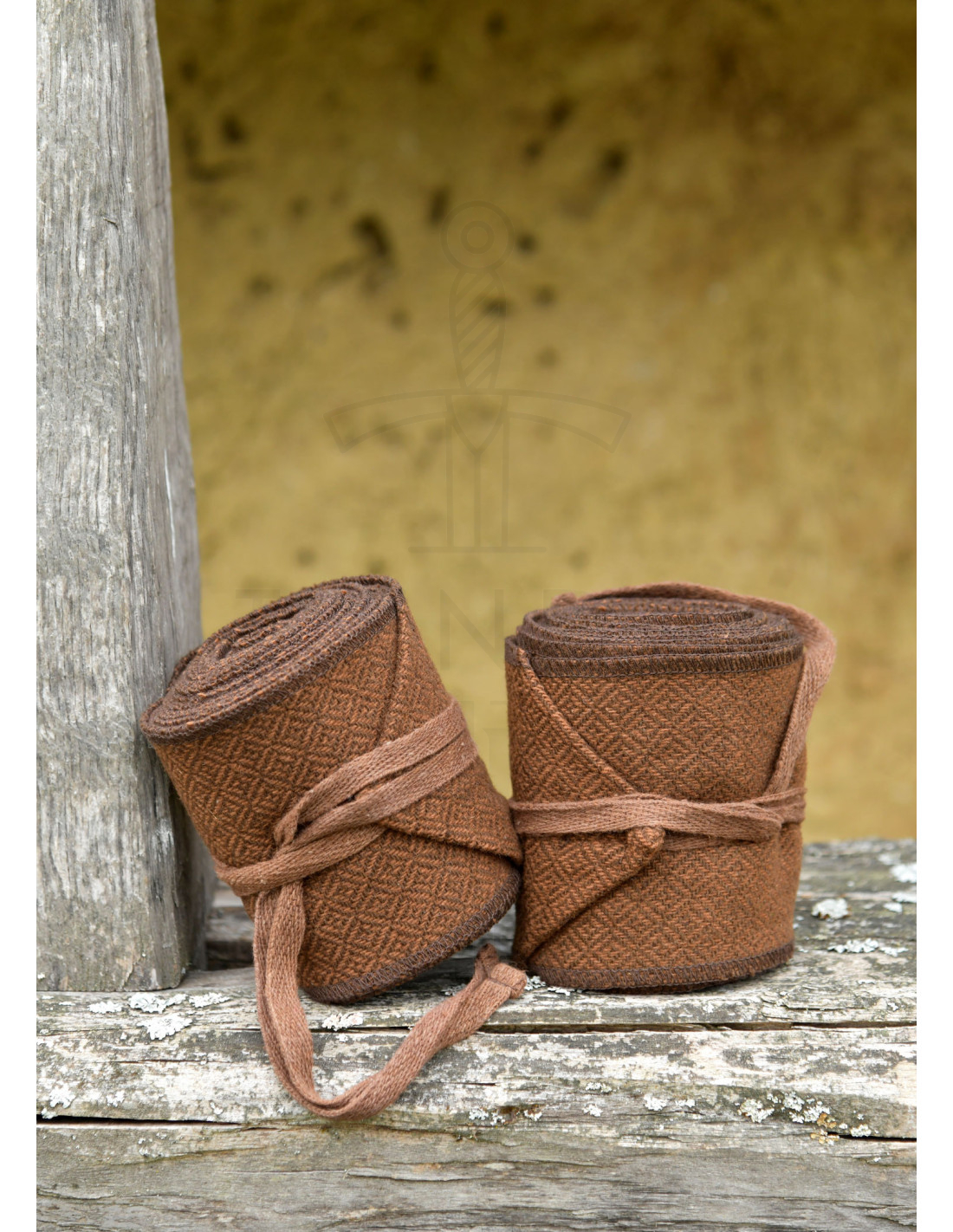Den vævede tekstur, synlig på billedet, hvor de to bandager vises rullet og bundet med det samme bånd, giver et kompakt og godt udført look, ideelt hvis du værdsætter stykker, der kombinerer æstetik og funktionalitet. Den båndslutning muliggør en personlig tilpasning, der er perfekt til både udendørsaktiviteter og lange reenactment-sessioner.