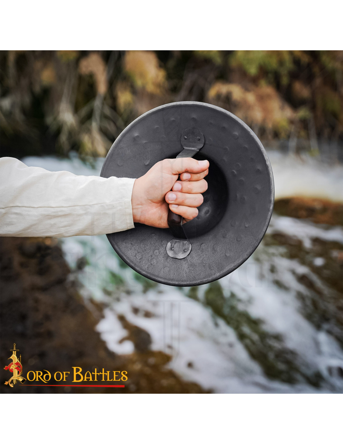 Håndsmedet i stål, skaber dens hamrede overflade en mat og ru finish, der undgår generende refleksioner og tilføjer karakter til hver blokering eller parry, mens de små depressioner jævnt fordelt giver tekstur og et autentisk udseende, der skiller sig ud i enhver iscenesættelse eller udstilling. Den sortlakerede farve forstærker det alvorlige og krigerske udtryk, perfekt til middelalderlige rekreationer eller fantasy kostumer.