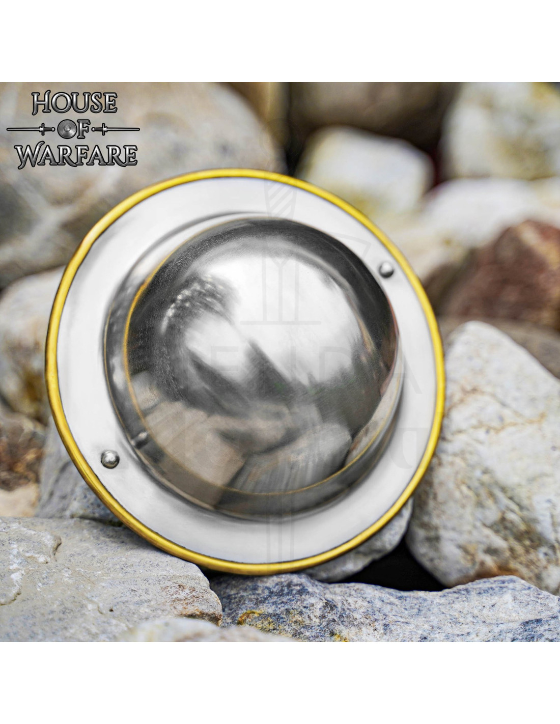 Dens cirkulære form og den blanke metaloverflade tiltrækker ikke kun blikke, men letter også hurtigere bevægelser og forsvar i simuleret kamp. Den gyldne kant, der løber rundt om hele omkredsen, tilføjer en elegant kontrast, der gør det til et fremtrædende element både i historiske replikater og i moderne samlinger.
