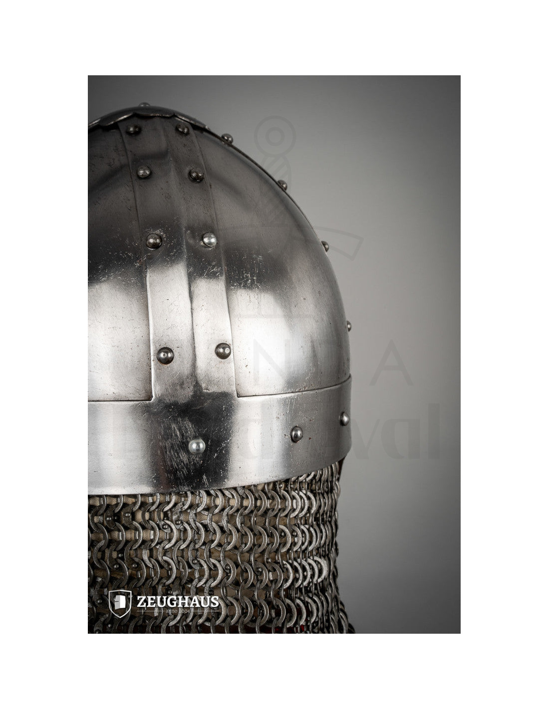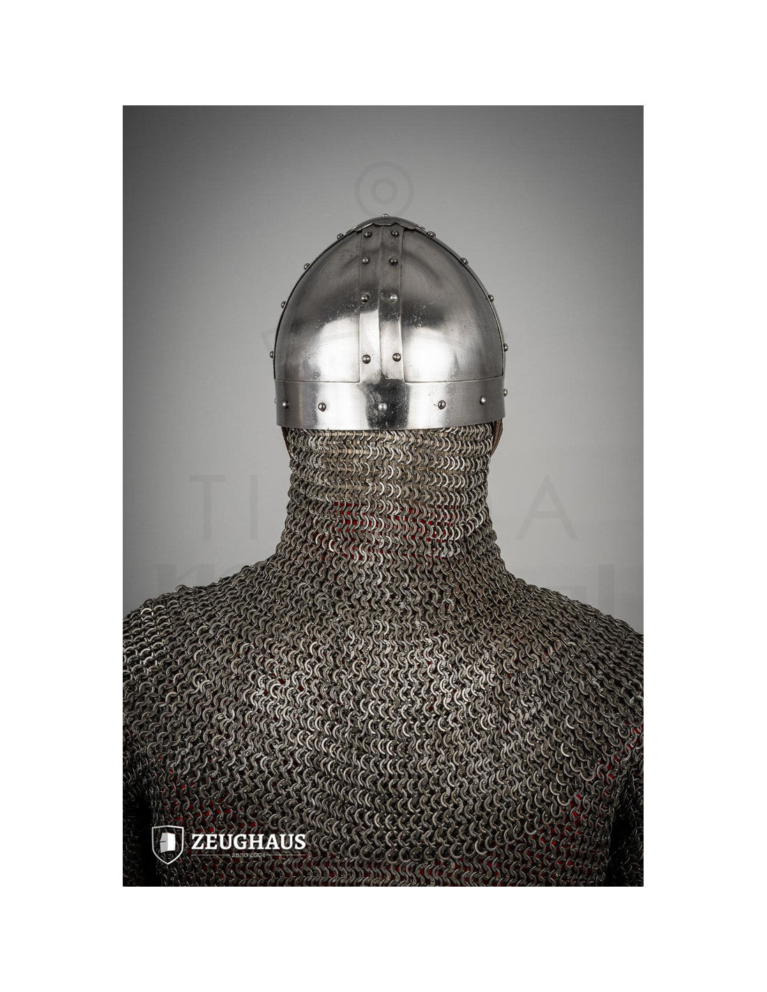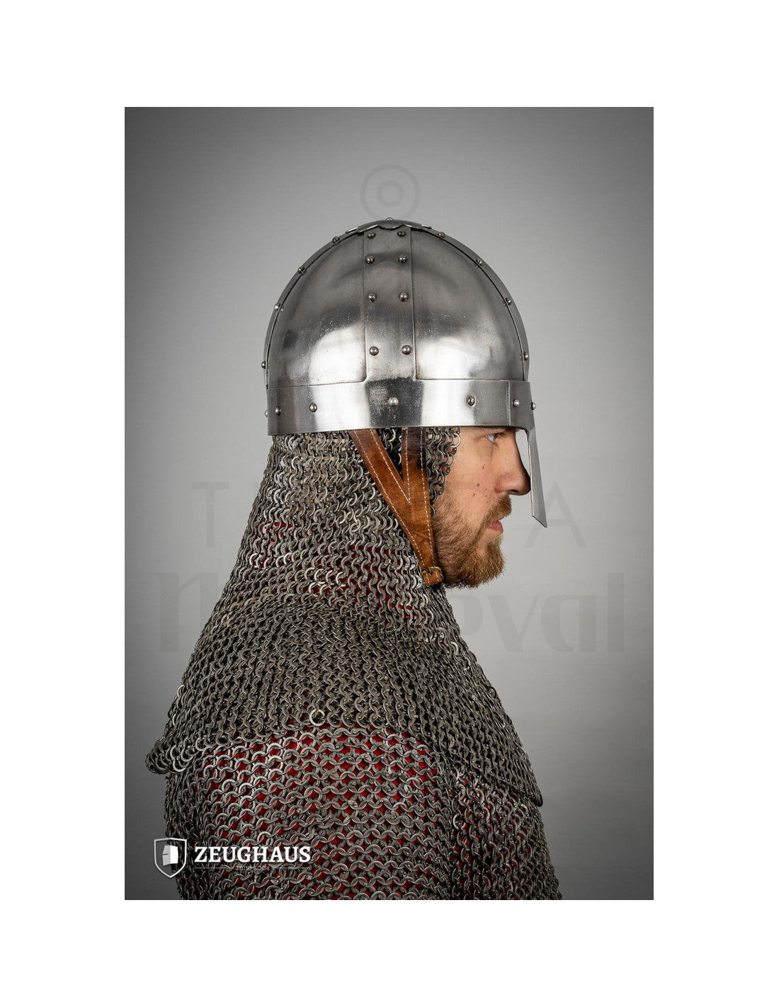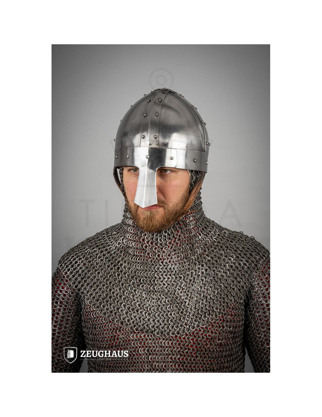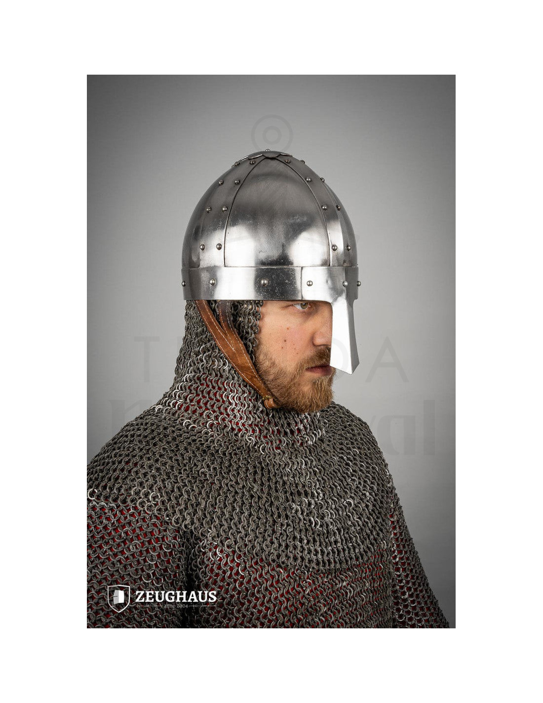 Denne hjelm har et unikt konisk design, der passer perfekt til brugerens hoved og giver et autentisk udseende og optimal beskyttelse. Det karakteristiske ved denne hjelm er dens næsebeskytter, som ikke kun tilføjer et strejf af stil, men også giver et ekstra lag af sikkerhed.