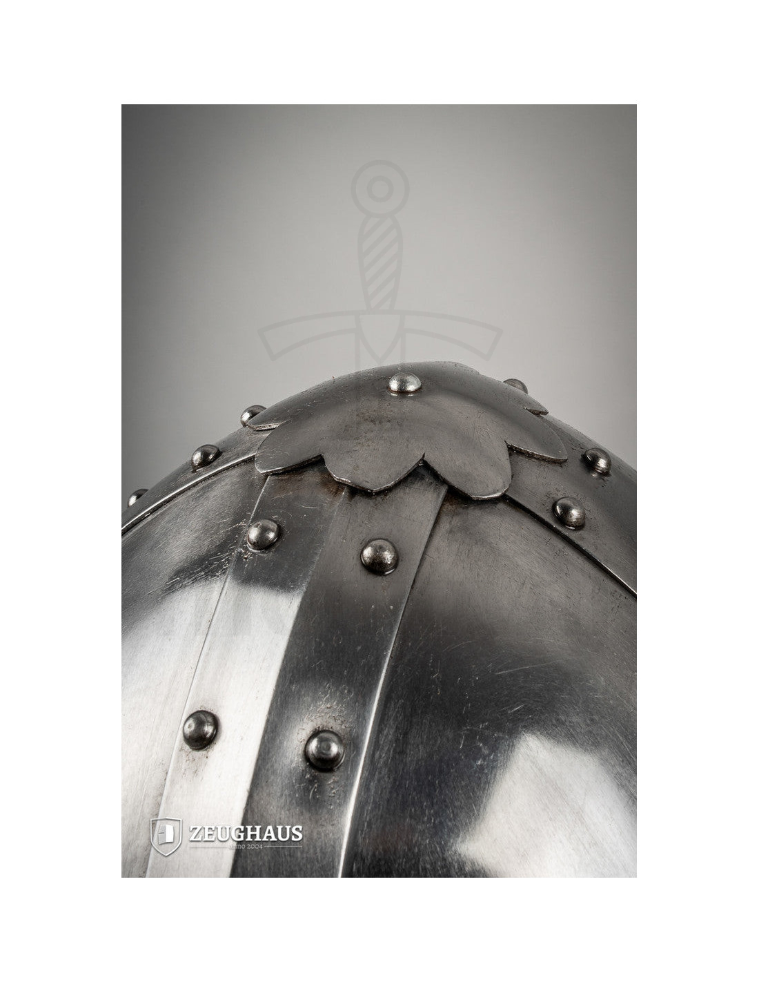 Gør dig klar til at dykke ned i historien med vores polerede stål Spangenhelm Viking hjelm! Inspireret af de historiske hjelme, der blev brugt under middelalderens Europa, er denne hjelm et sandt mesterværk af håndværk. Dens navn, 'Spangenhelm', kommer fra de metalstrimler, der udgør dens struktur, og forbinder fire stålplader for at skabe et modstandsdygtigt og autentisk forsvar.