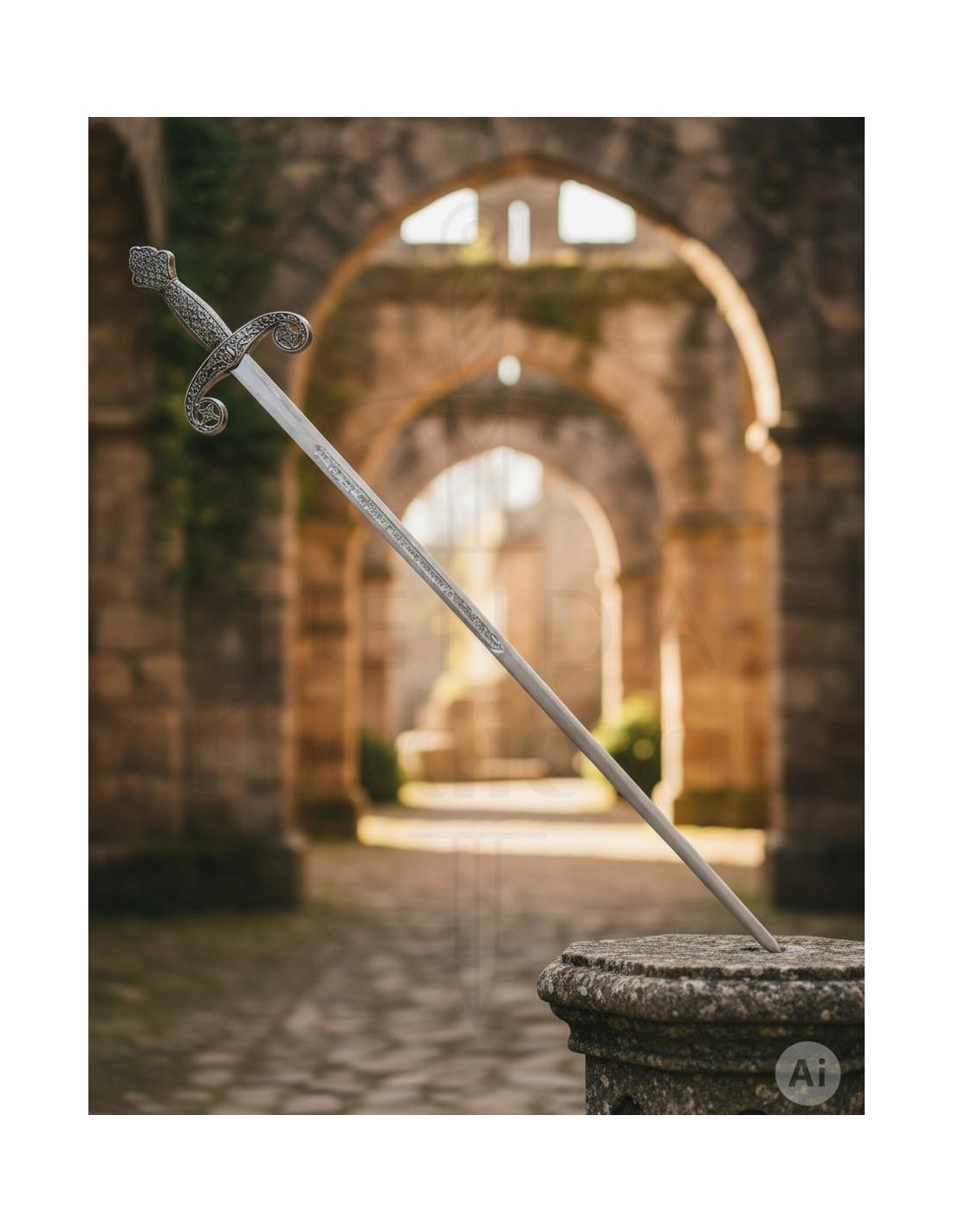 The Silver Colada Sword of El Cid er en autentisk historisk juvel, der tilhørte den legendariske castilianske ridder Rodrigo Díaz de Vivar, kendt som EL CID CAMPEADOR i det 11. århundrede. Denne modige castilianske adelsmand og kriger dominerede praktisk talt hele den østlige del af den Iberiske Halvø og legemliggjorde prototypen af en ridder med de...