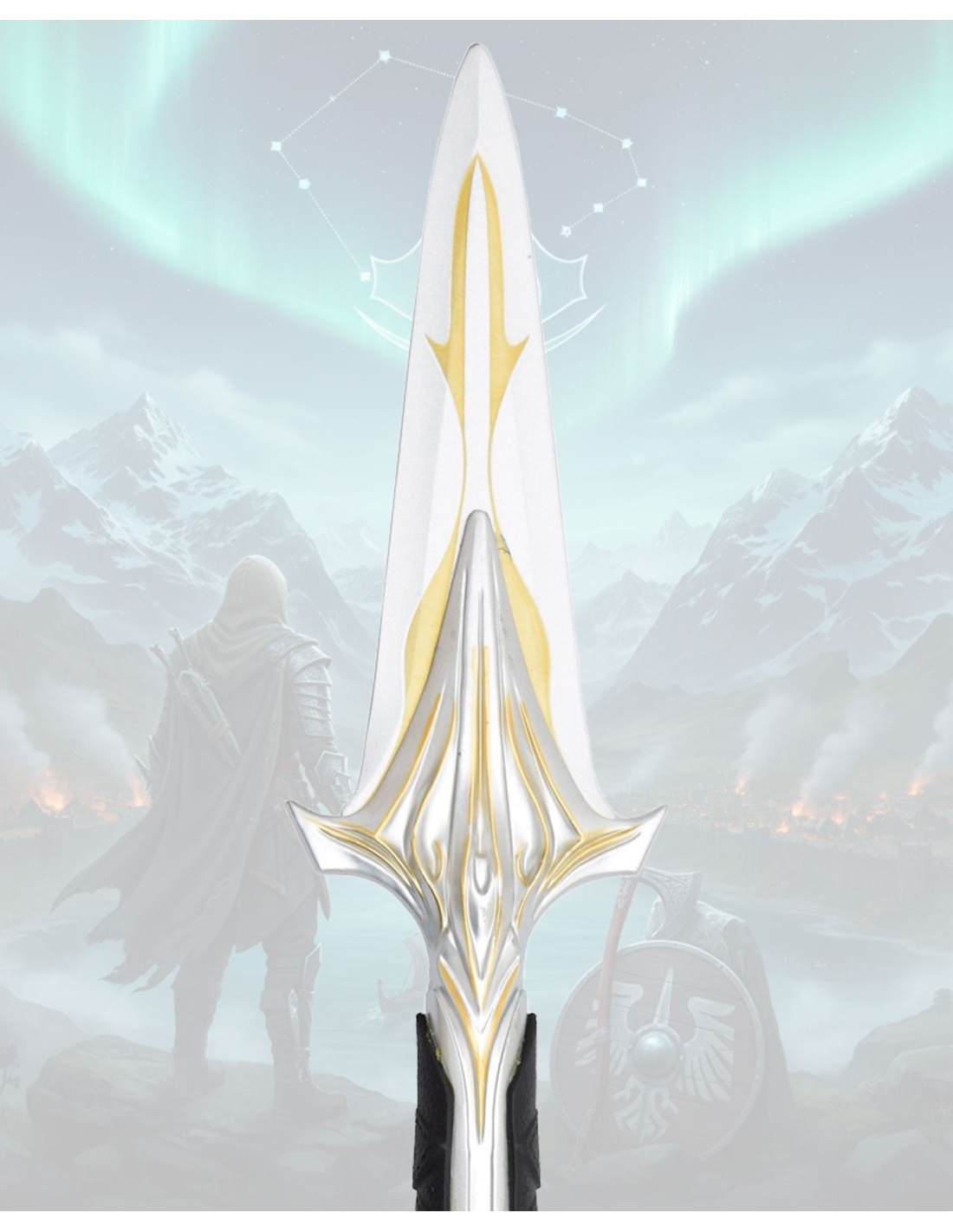 Bladet i stål har en bred og spids silhuet, fremhævet af ornamentale linjer i gyldne nuancer, der giver en høj tilstedeværelse og visuel modstandskraft, ideel til stolt fremvisning. Kombinationen af metal og plastik i håndtaget tilbyder en balance mellem robusthed og komfortabel håndtering, når det placeres, mens de gyldne relieffer og udsmykninger tilføjer et sofistikeret touch, som løfter ethvert miljø.