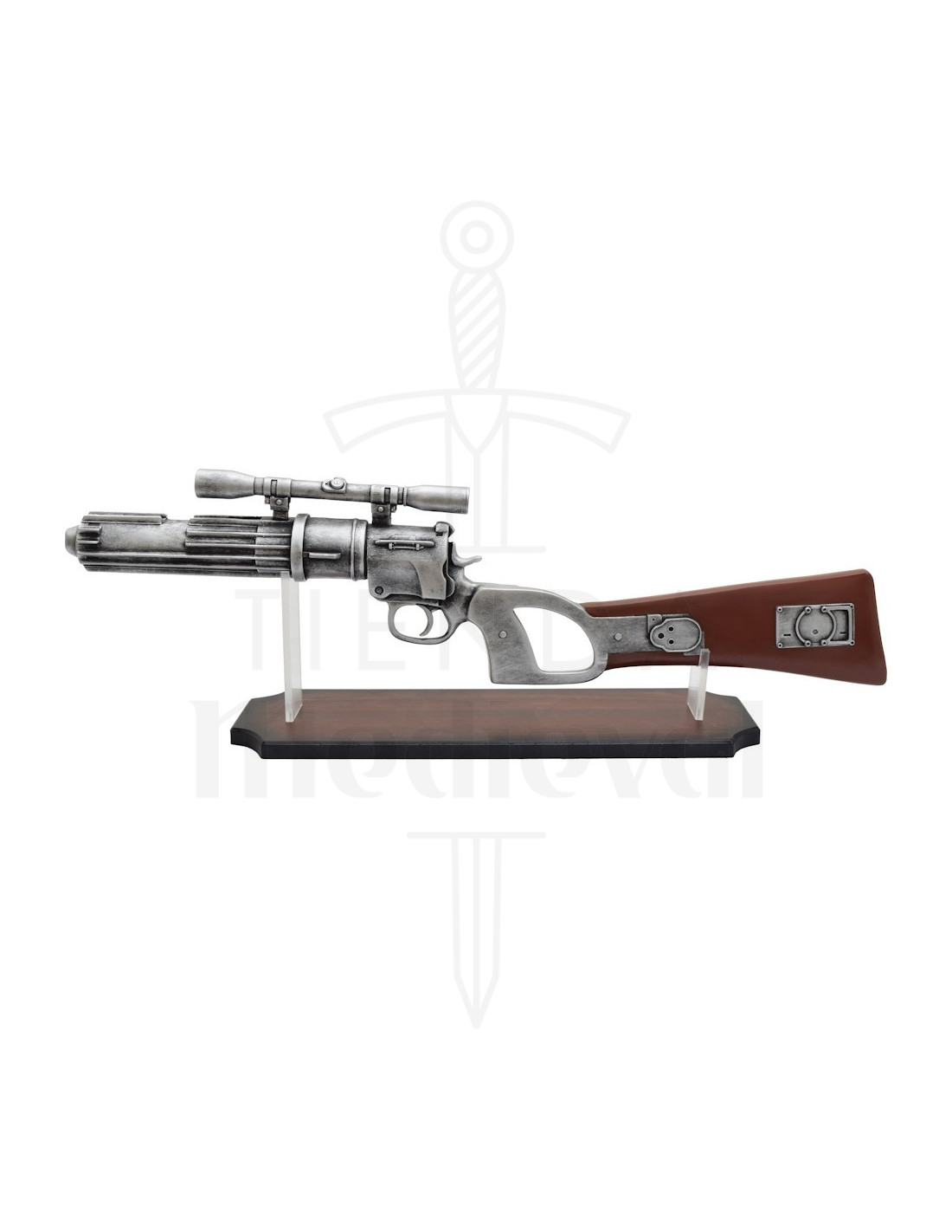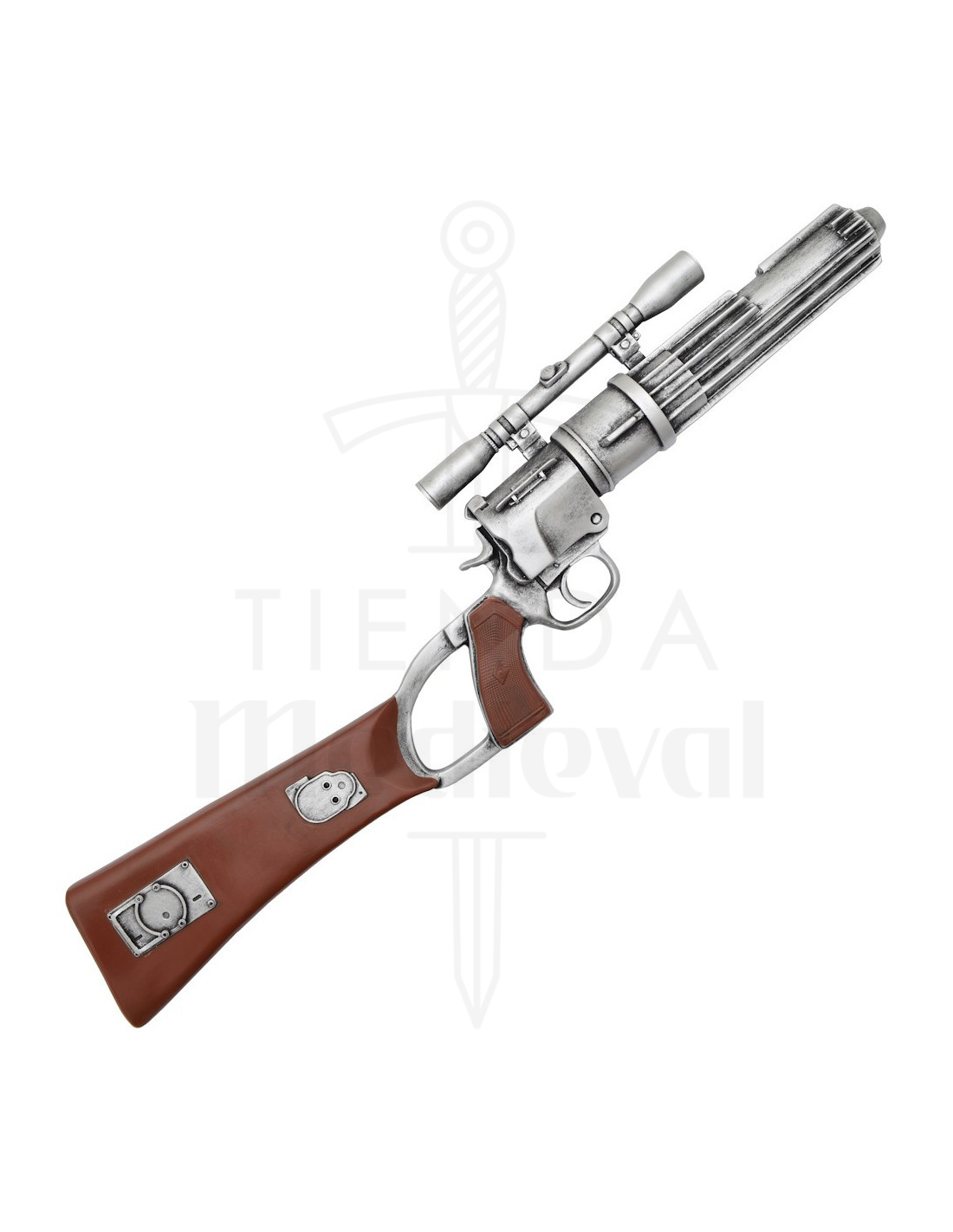 Denne blaster kombinerer den klassiske æstetik fra et revolver med futuristiske indslag, hvilket giver en unik tilstedeværelse: det sølvfarvede kabinet med cylinder og det lange løb med riller giver et teknisk og detaljeret præg, mens det teleskopiske sigte og den konturerede silhuet skaber en følelse af filmautenticitet. Den høj-kvalitets resinfinish muliggør skarpe detaljer, så hver tekstur og hver metalplade træder tydeligt frem.