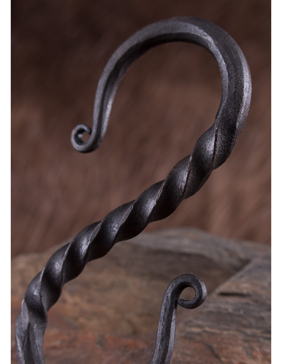 Den har en snoet midtersektion og runde smedede og rullede ender. Denne jernkrog blev efterladt i sin naturlige finish, og smedningens signaturlag af skæl giver den et autentisk look. Måler cirka 10 x 4,5 cm og med en åbningsbredde på omkring 1,5 cm, denne håndsmedede stålkrog er en fantastisk tilføjelse til enhver samling af middelalder- og renæssanceværktøjer.