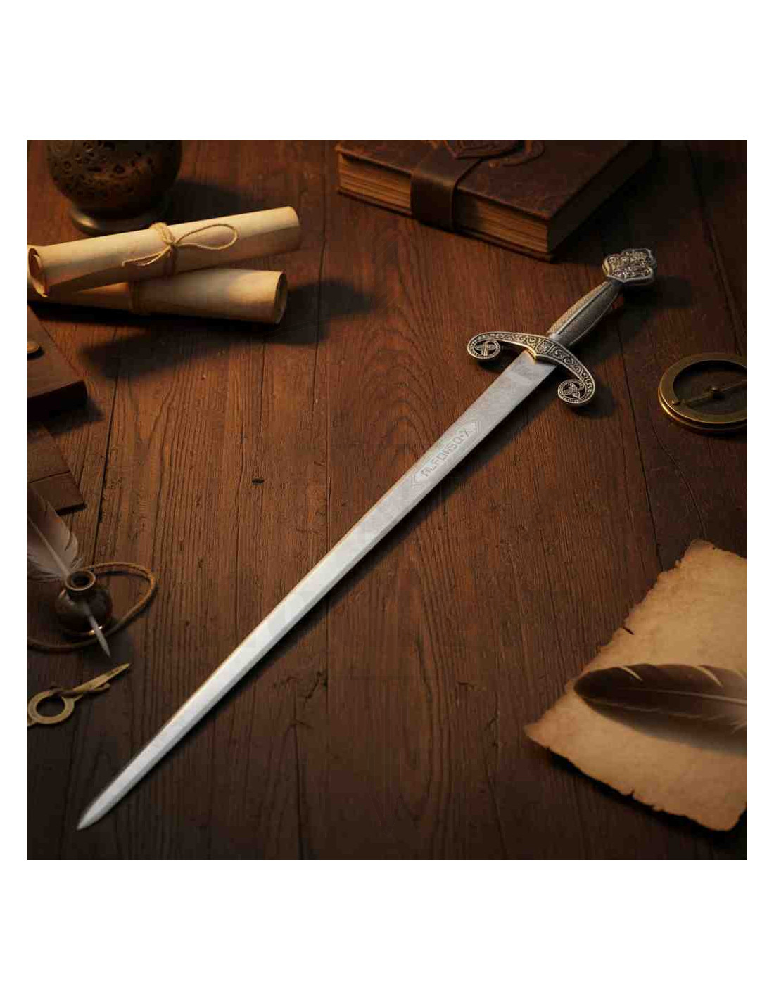 Oplev majestæten af Alfonso X Sword, et unikt stykke fremstillet i Toledo, Spanien. Dens rustikke riflede klinge i rustfrit stål giver den et autentisk og robust udseende, mens dets håndlavede ribhåndtag tilføjer et strejf af elegance. Derudover er beskyttelsen, grebet og pommel forgyldte, hvilket giver en sofistikeret finish.