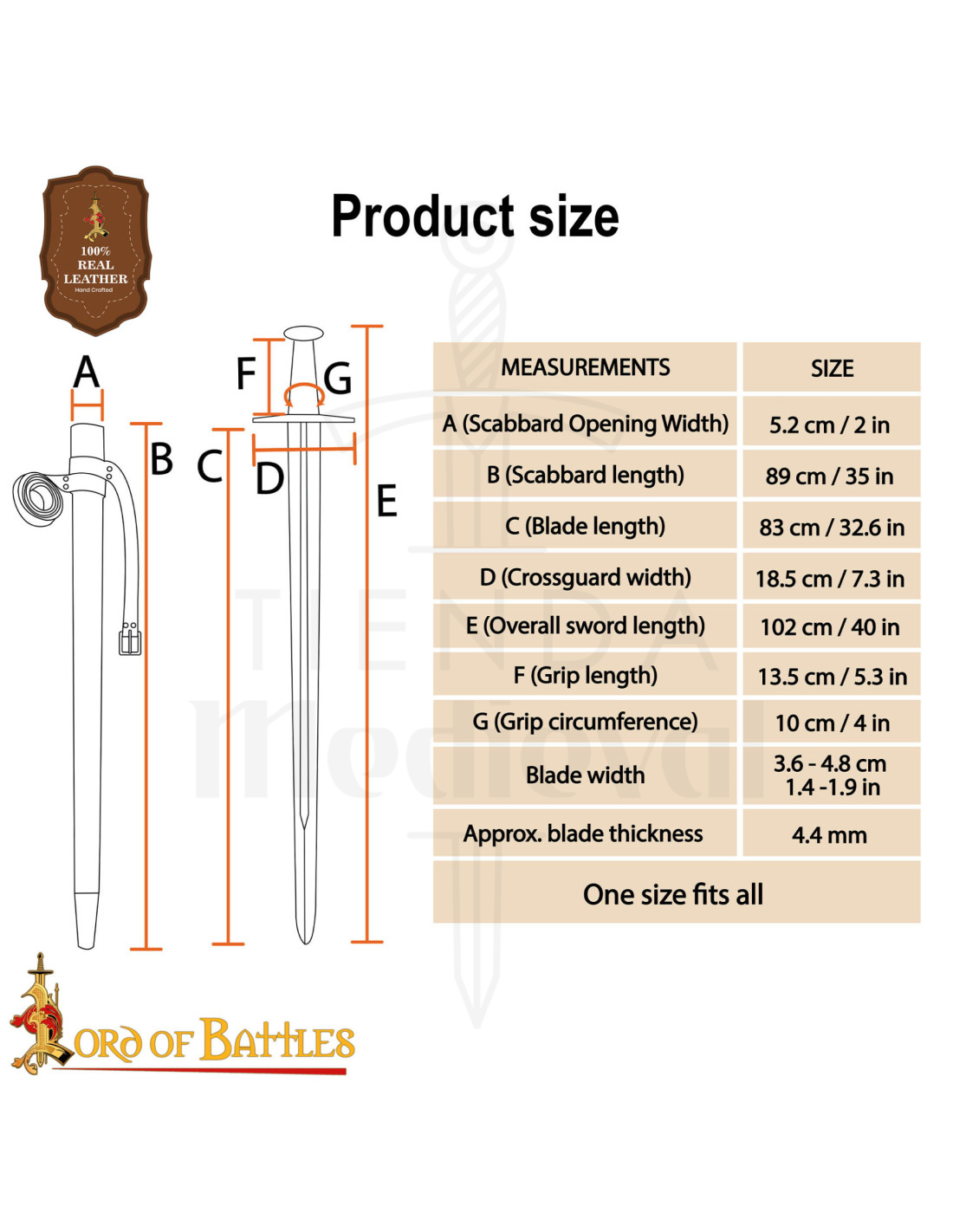 Hvis du er interesseret i at købe et sværd, vil du finde i dette stykke en kombination af middelalderlig æstetik og nutidig nytte: et sværd designet til at blive følt, båret og vist stolt.