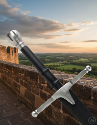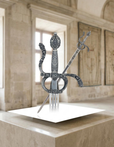 Med en finish i ældet sølv og bladet i rustfrit stål er dette sværd et holdbart kunstværk, der forbliver lige så imponerende med tiden, som det var ved modtagelsen. Tilgængelig i to størrelser, passer det til dit rum og din stil—om du ønsker at berige din samling eller dekorere med personlighed. Hvert detalje, fra håndtaget til det indgravede blad, inviterer dig til at føle stolthet over at eje en rekonstruktion, der repræsenterer perioden under den store konge Felipe II, et symbol på den Spanske Guldalder.