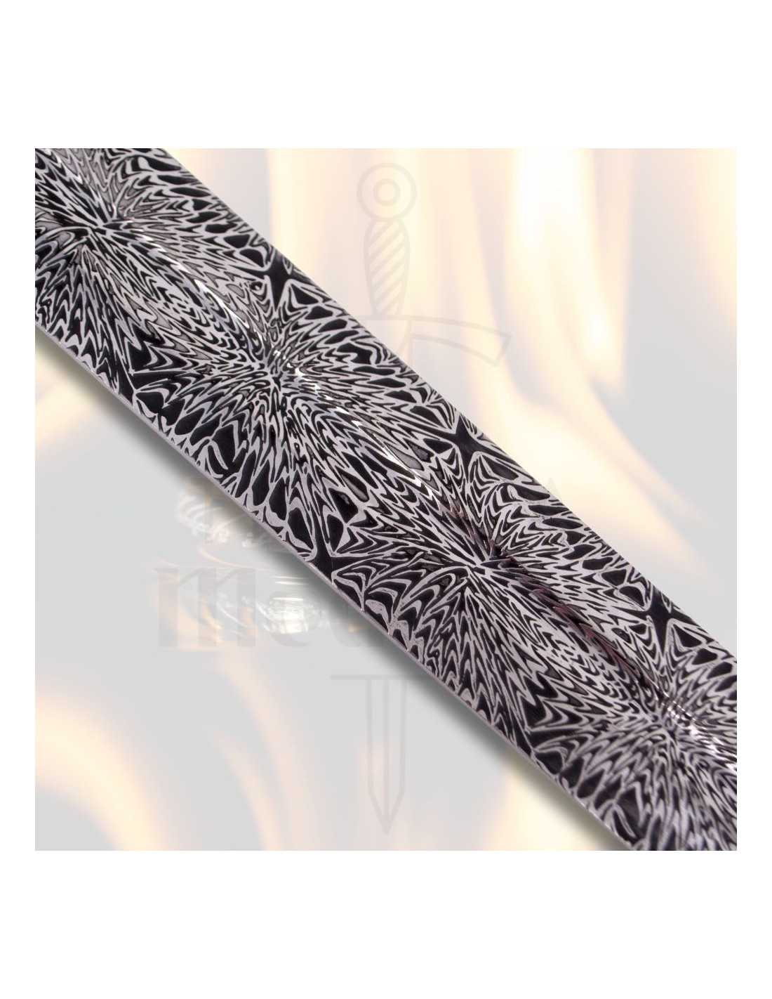 Klingen, lavet af poleret stål med indgraveringer, der minder om damaskus, skiller sig ikke kun ud med sit udsmykkede design, men også med kvaliteten af sin konstruktion. Dens generøse længde gør den til et imponerende stykke, ideelt til udstilling. Håndtaget kombinerer finish i nikkel og brun, afsluttet med et pommel og et kors dekoreret med detaljerede motiver, der fremhæver dens mytiske karakter. Dens ergonomiske greb sikrer et behageligt greb, mens det medfølgende stativ gør, at du kan vise det, som det fortjener.