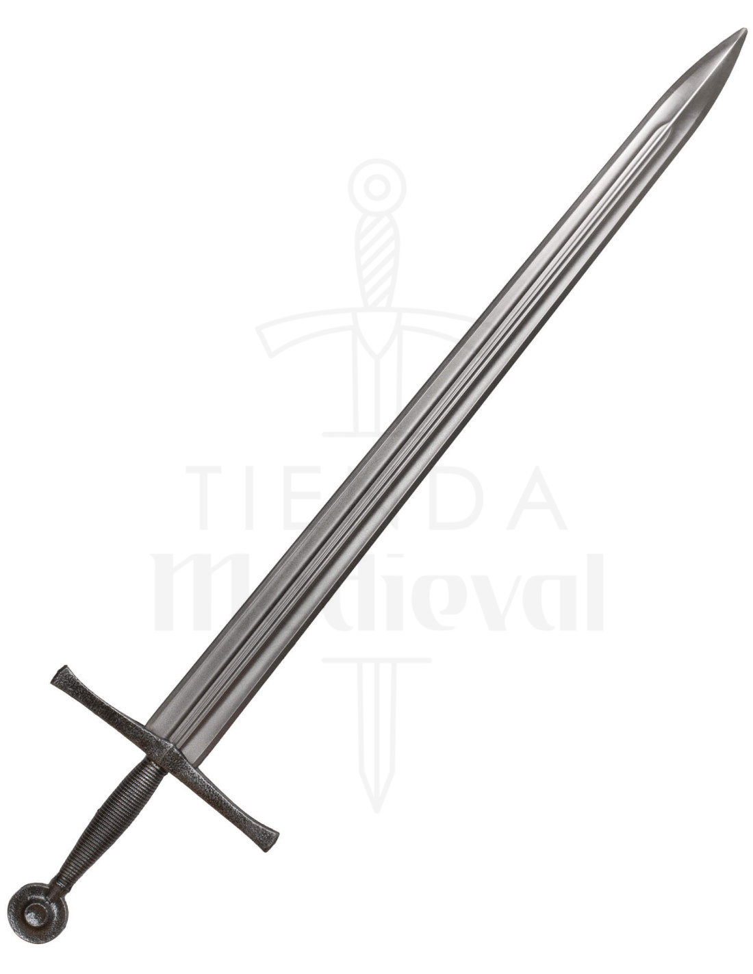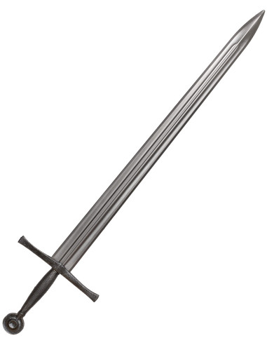 Takket være dets fremstilling i PU-skum og glasfiber kombinerer dette sværd den klassiske kunsts følsomhed med moderne innovation. Det flettede håndtag og den robuste beskyttelse giver et fast og sikkert greb, mens de elegante linjer og den metalliske finish tilføjer et præg af realisme og sofistikation. Det lange, slanke blad med dobbelt centralkanal og spids gør dette sværd ikke kun effektivt i kamp, men også til et visuelt spektakel på enhver scene.