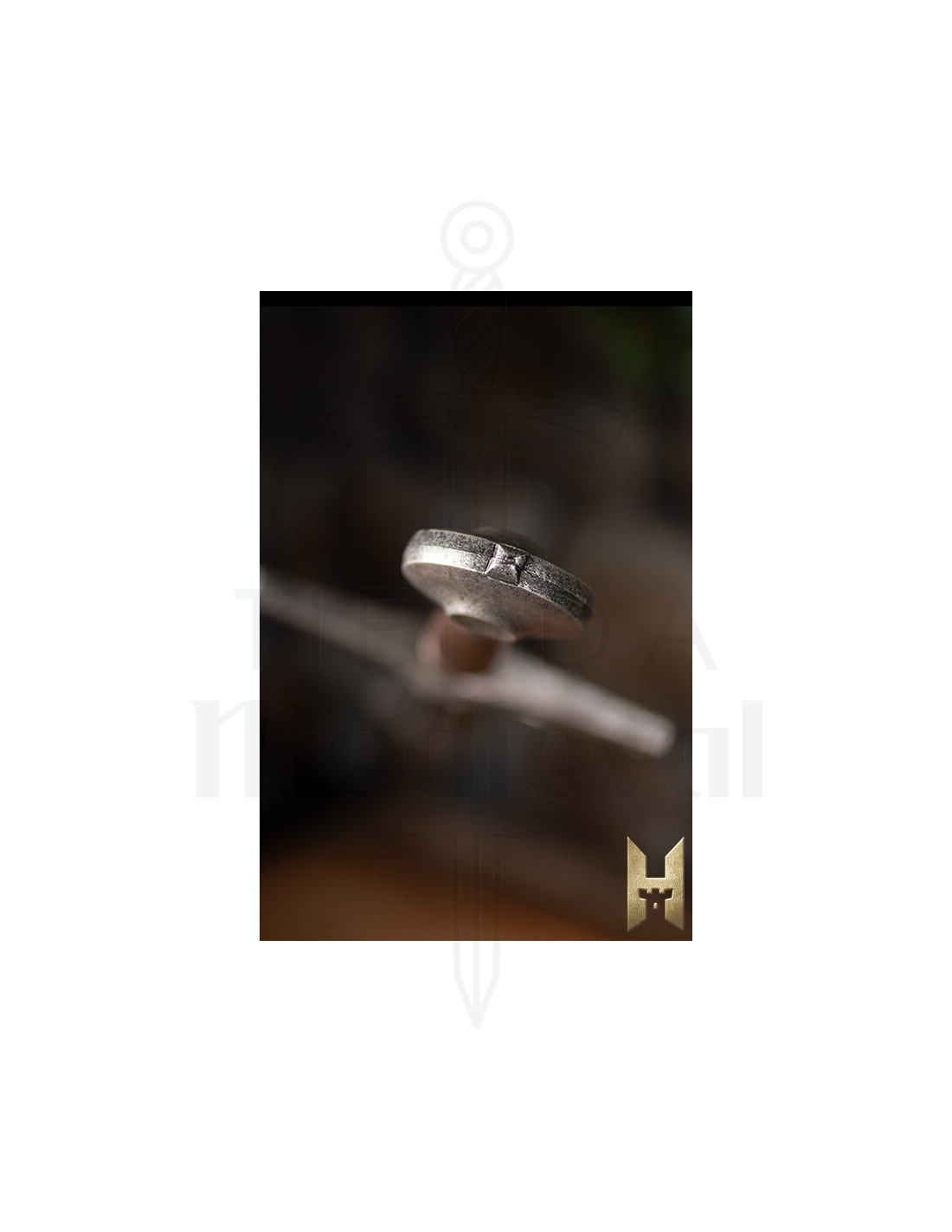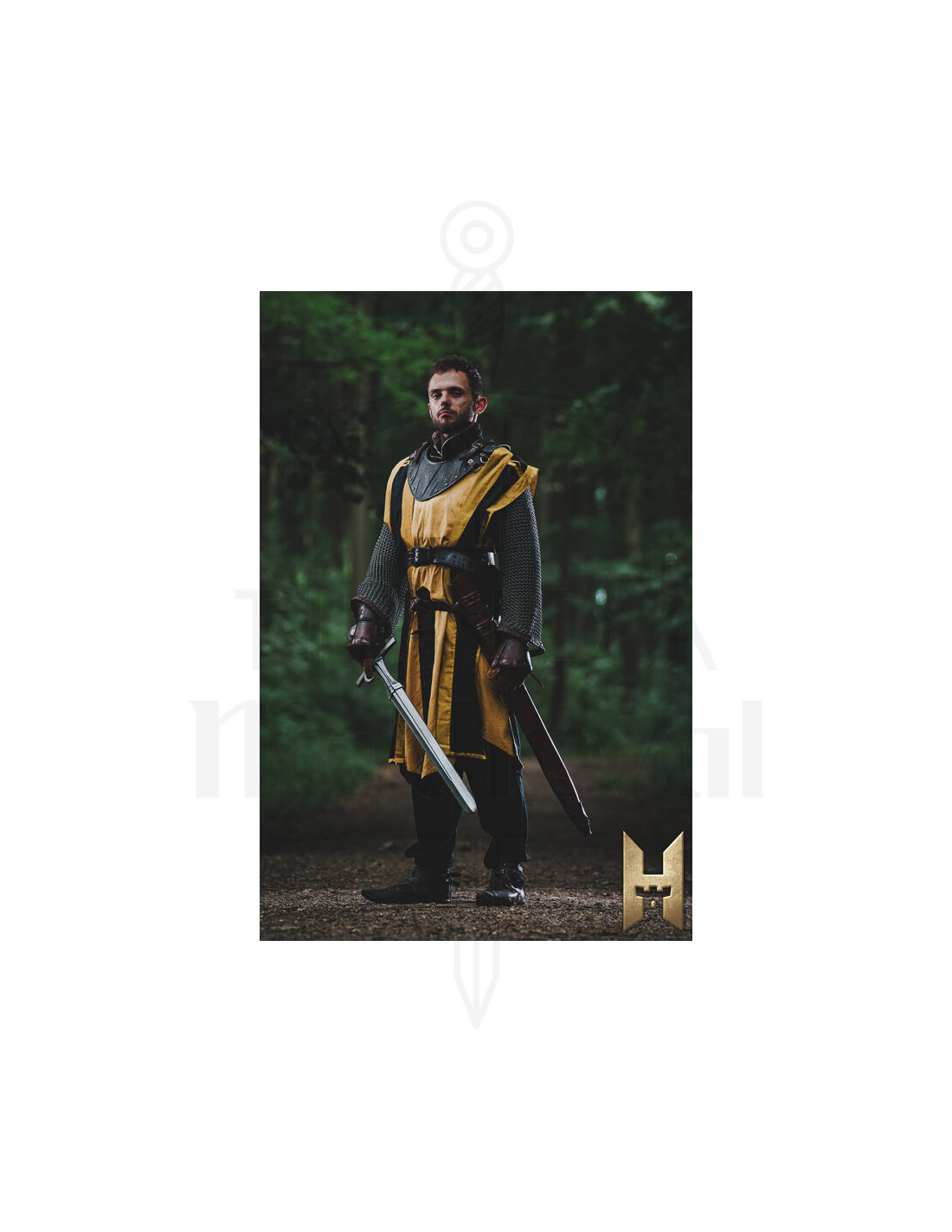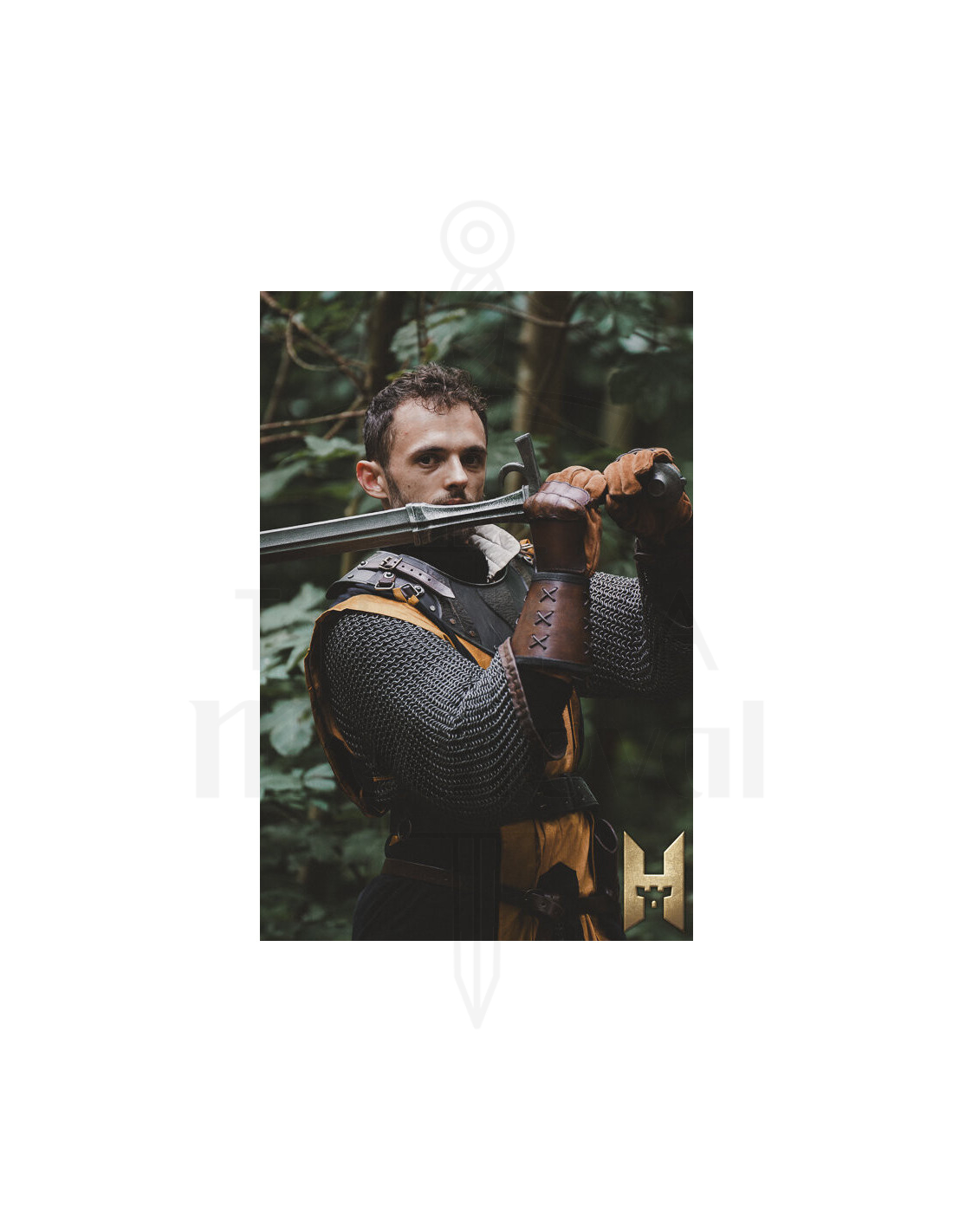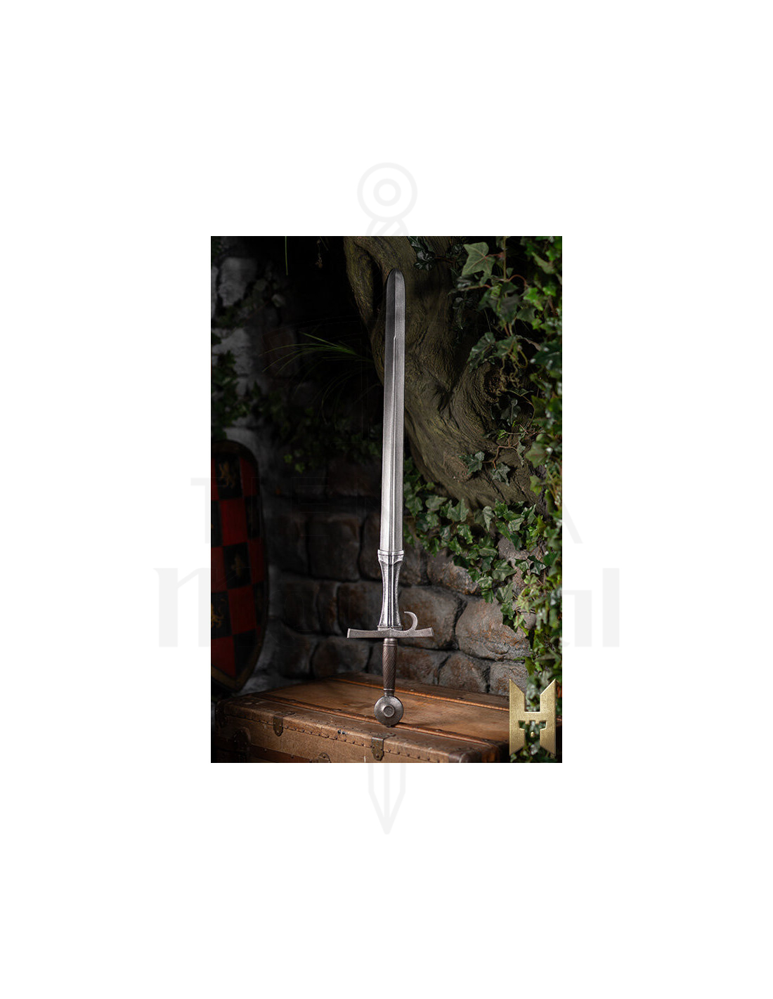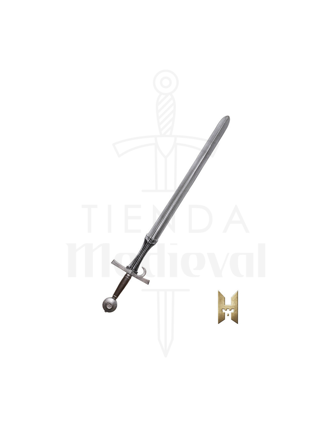 Det formede håndtag i tårnform, dækket med læder, giver et behageligt og sikkert greb, selv under dynamiske kampe. Den minimale beskyttelse og den afrundede pommel fuldender et elegant og funktionelt design, der prioriterer enkelhed og effektivitet i hver bevægelse. Den blanke overflade giver et realistisk og tiltalende udseende, ideelt for samlere eller cosplay-entusiaster, der ønsker udstyr, der skiller sig ud med sin ægte middelalderlige stil.