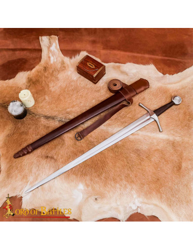 Denne reproduktion fanger essensen af de våben, der ændrede den middelalderlige kamp, og tilbyder en oplevelse, der går ud over æstetik. Det håndsmedede blad giver en kombination af styrke og fleksibilitet, der resulterer i en afbalanceret håndtering, hvilket muliggør præcise bevægelser og tillid både ved rekreationer og på udstillinger. Den full-tang konstruktion med peened pommel garanterer langvarig soliditet, så stykket bevarer sin oprindelige ydelse episode efter episode.
