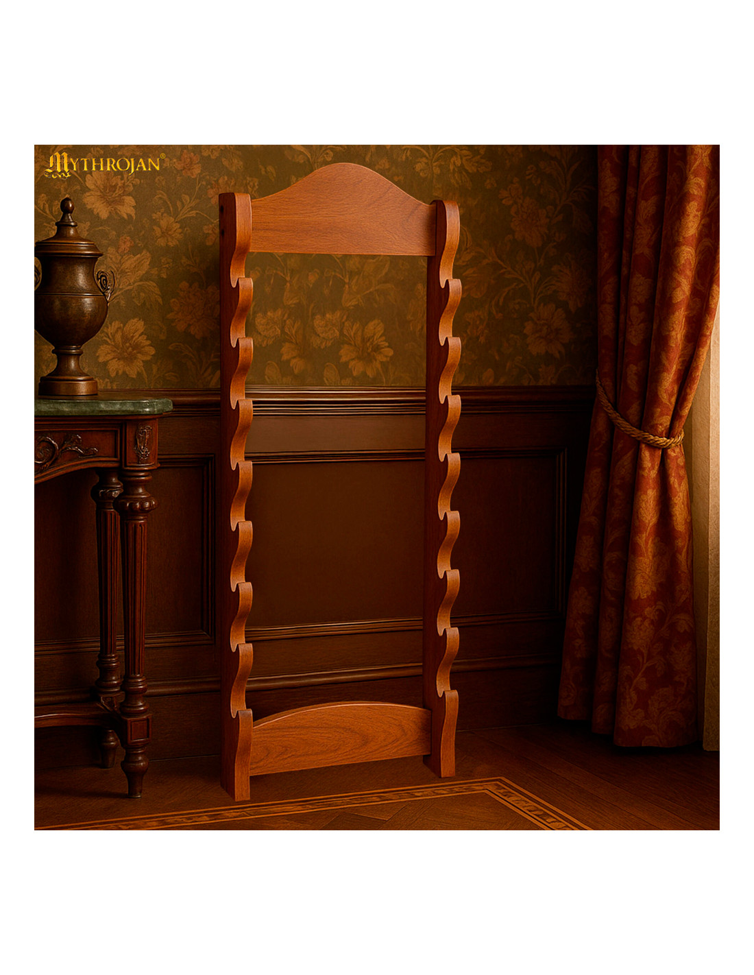 Mythrojans vægbeslag i massivt træ er den perfekte løsning til at vise dine sværd eller katanaer elegant og sikkert. Med kapacitet til at hænge op til 8 sværd vandret, giver denne holder dig mulighed for at vise din samling på en organiseret måde og fremhæve skønheden ved hvert stykke.