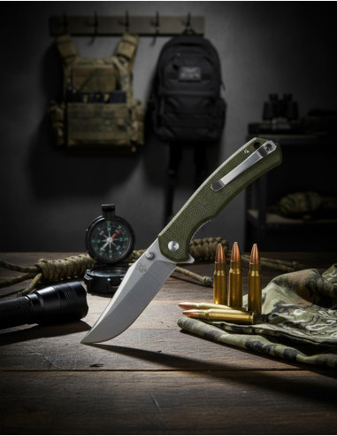 Det ergonomiske greb, med sorte huller, sikrer et fast og behageligt greb, hvilket minimerer risikoen for glidning. Nylonhylsteret med clip-lukning muliggør sikker og diskret transport, hvilket øger knivens praktiske anvendelighed og bærbarhed.