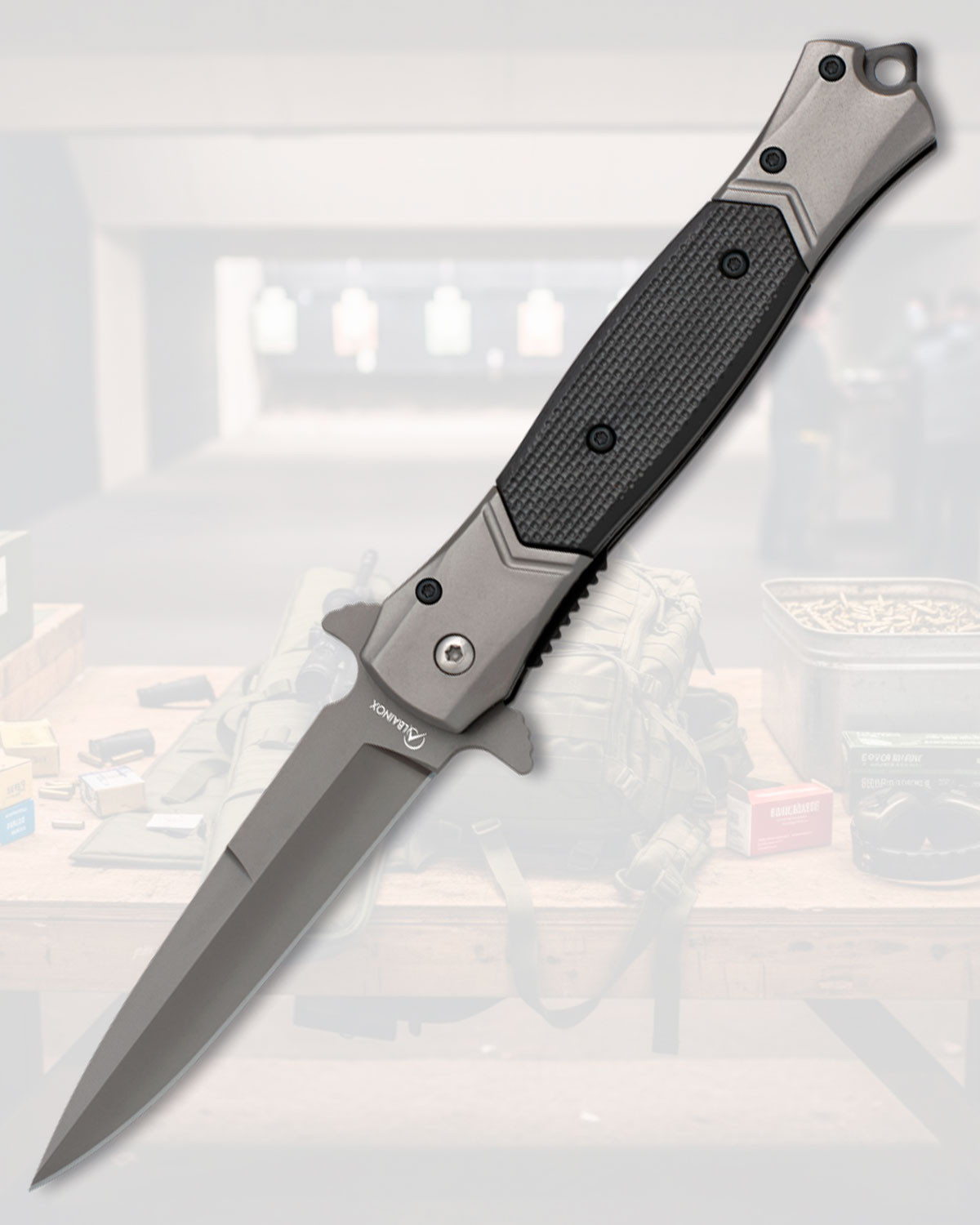 Albainox taktisk kniv i titaniumfinish, 9 cm klinge.