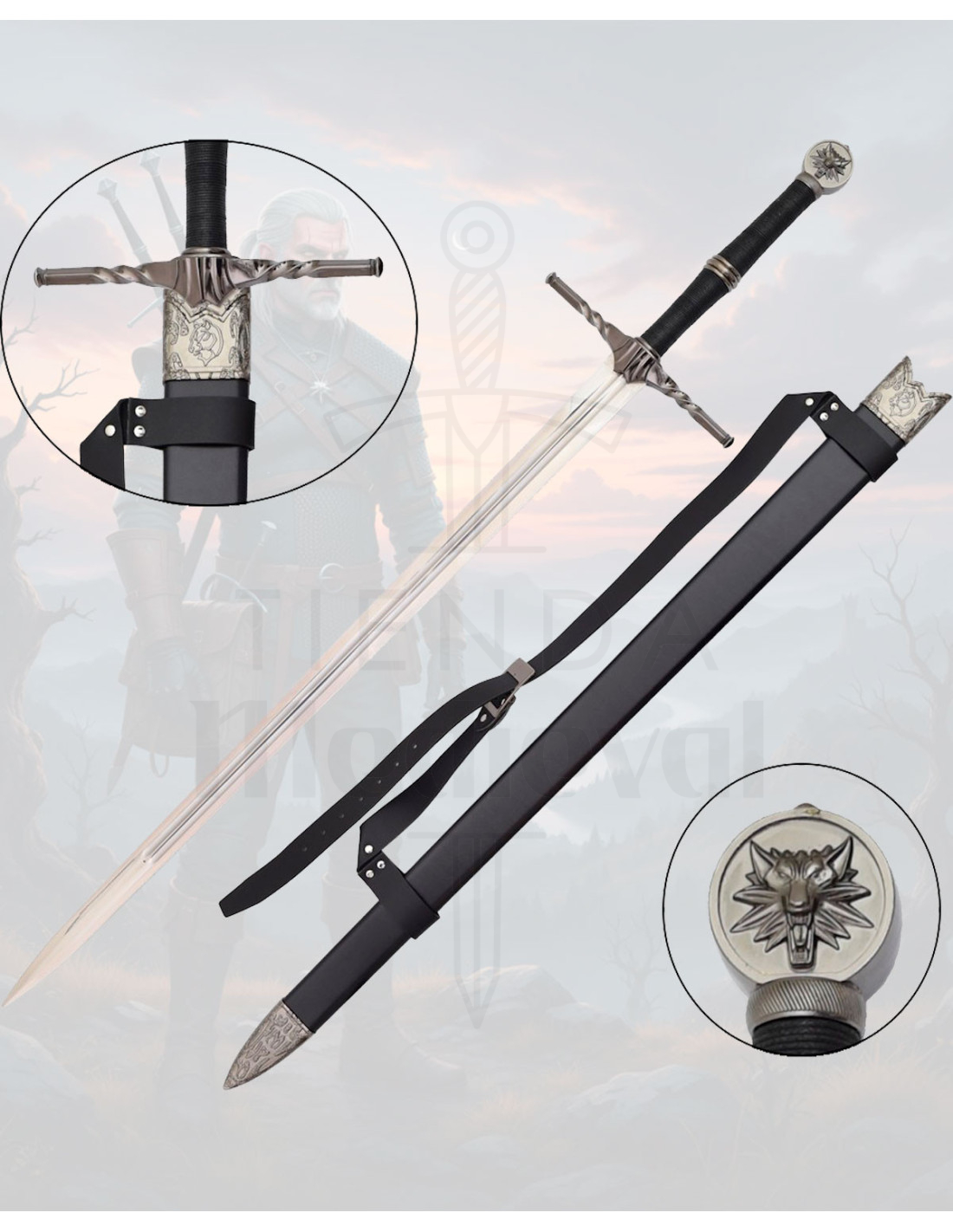Denne replica fanger tilstedeværelsen af det legendariske jagtvåben, og giver en følelse af soliditet og realisme fra første kontakt. Det metalblad i sølvfinish og med dobbelt skær giver styrke og refleksioner, der skiller sig ud i enhver udstilling, mens den centrale rille tilføjer visuel dybde uden at gå på kompromis med vedligeholdelsen. Garderen med snoede ender og pommelen med den indgraverede ulvehoved forstærker denne emblematiske karakter, og tilbyder omgående tiltrækningskraft i både udstillinger og tema-fotografier.