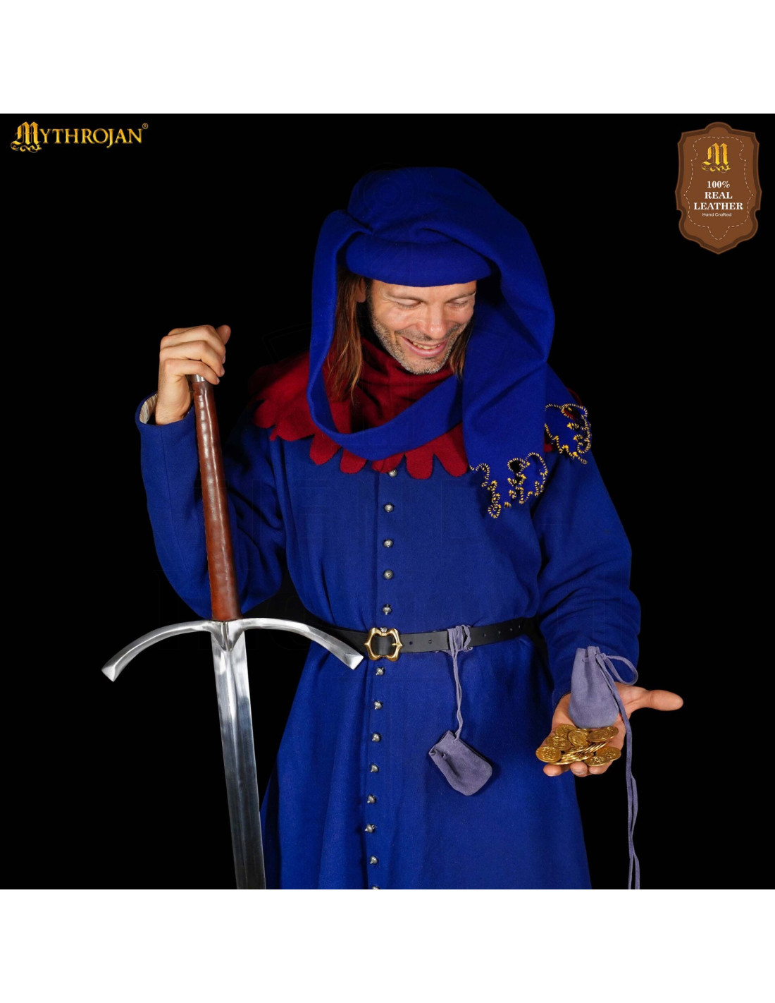 Hvis du søger et autentisk og funktionelt touch til dine middelalderlige eventyr eller fantasitemaer, er dette sæt med 2 limosner i ruskind i en elegant blå farve lige det, du har brug for. Med en håndværksmæssig stil er hver pose omhyggeligt lavet af førsteklasses ruskind, hvilket sikrer holdbarhed og et ægte udseende, der vil forbedre enhver historisk eller fantasifuld påklædning.