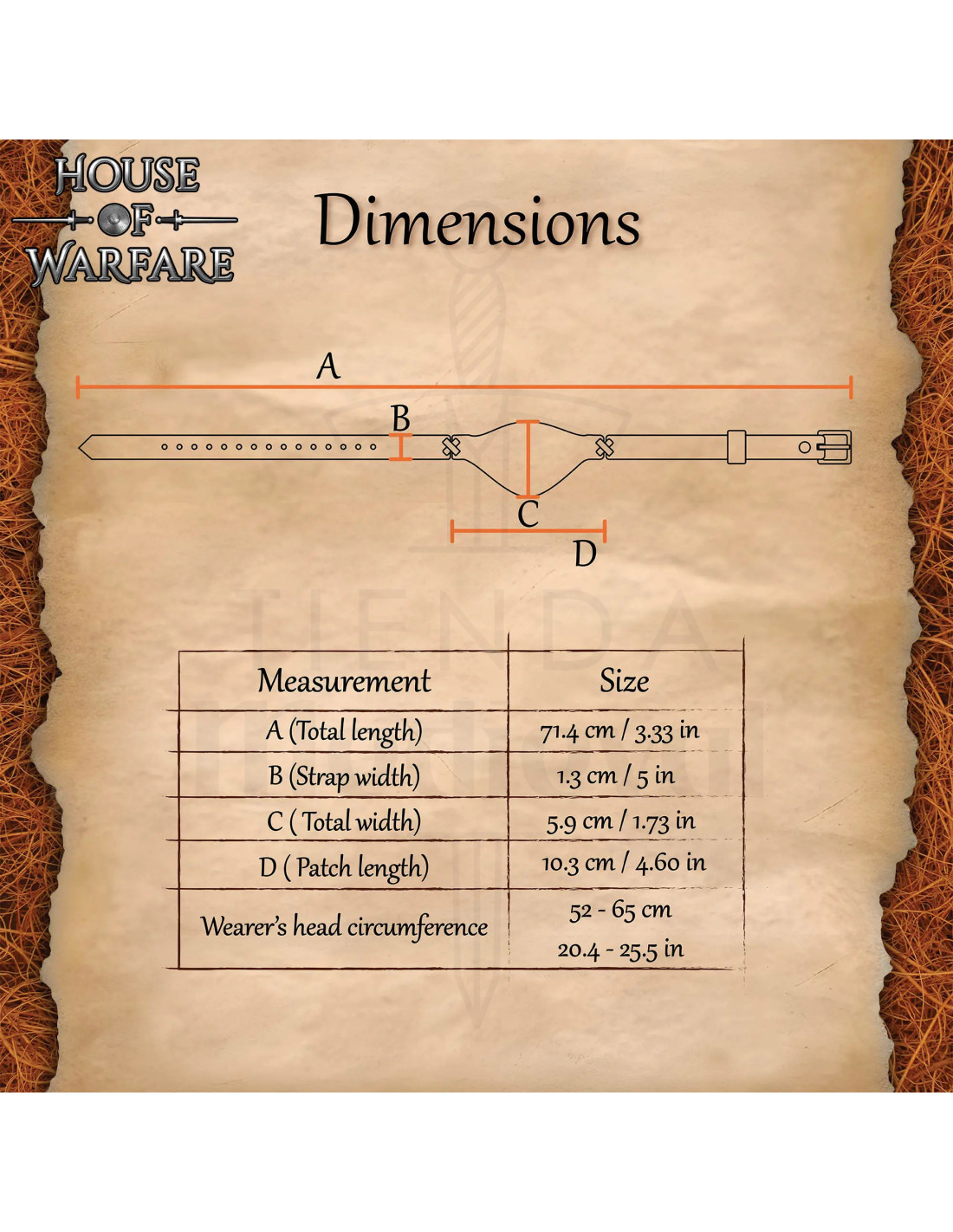 Designet inkluderer synlige håndsyning, der forstærker forbindelsen mellem patchen og remmen, hvilket giver styrke og et traditionelt udseende. Den justerbare rem i samme sorte tone, afsluttet med en metalspænde, gør det muligt at regulere pasformen sikkert og komfortabelt, så den tilpasser sig hoveder af forskellige størrelser uden at miste stabilitet under bevægelse eller optrædener.