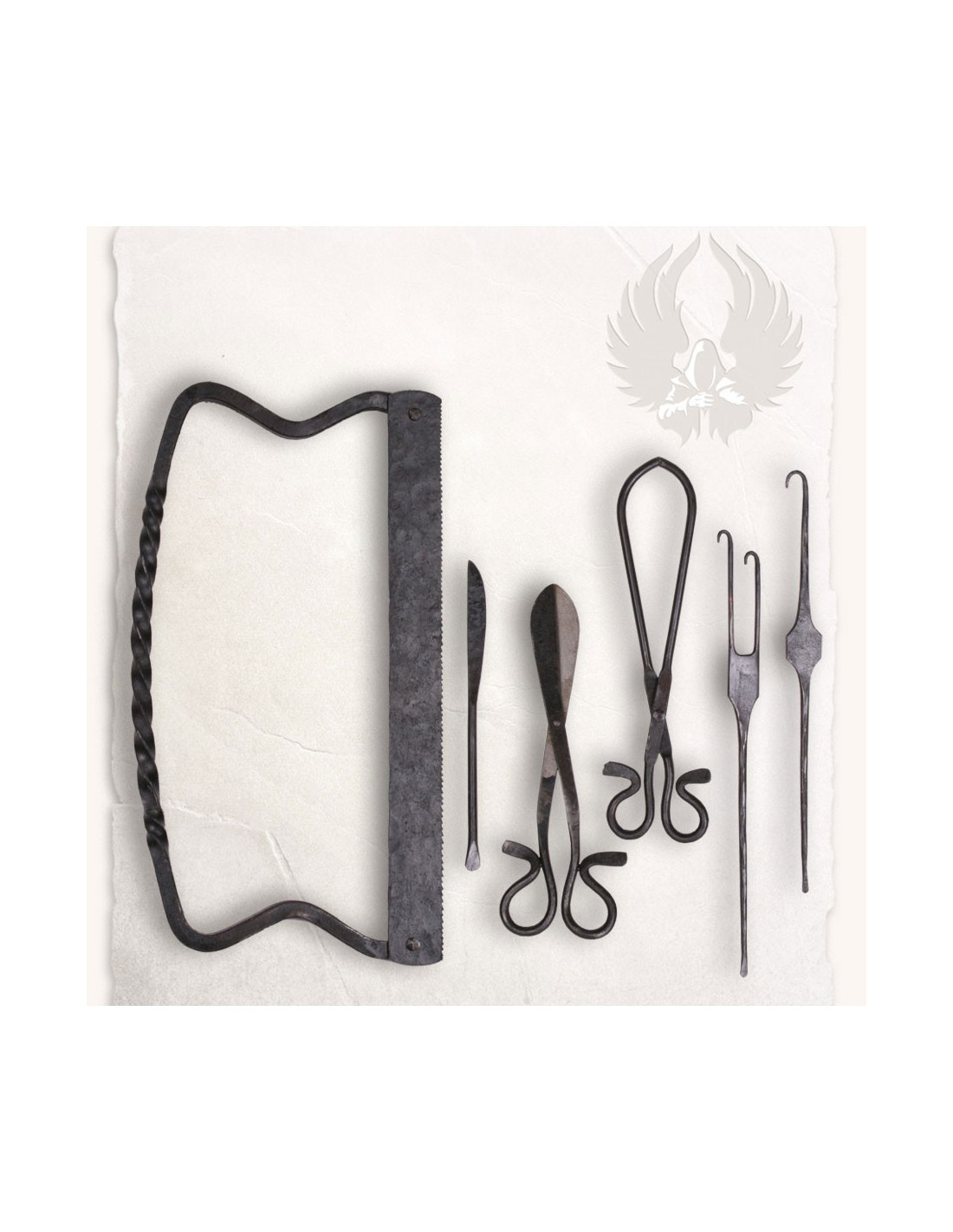 Det middelalderlige kirurgiske sæt består af 6 enestående værktøjer, hver designet med omhyggelige detaljer og følger tidens historiske standarder. Disse værktøjer inkluderer en sav, en tang, saks, en dobbeltkrog, en krog og en skalpel. Hver af dem er blevet skabt med nøjagtige mål for at give dig en autentisk og realistisk oplevelse under dine kirurgiske re-enactments.