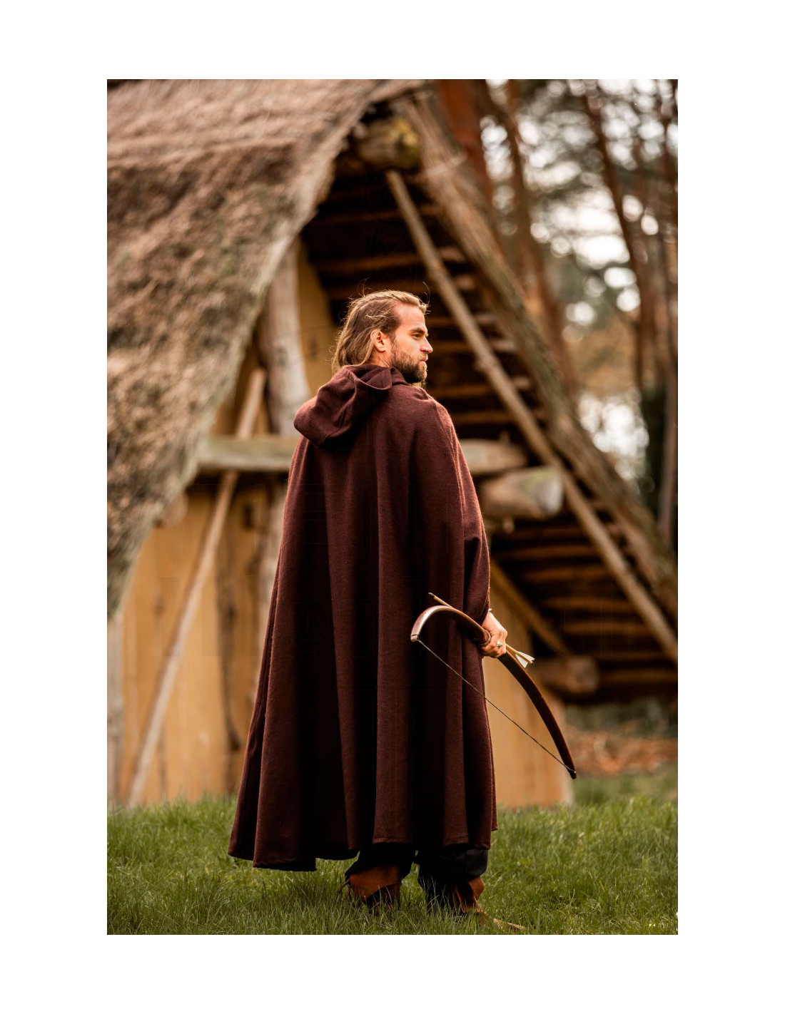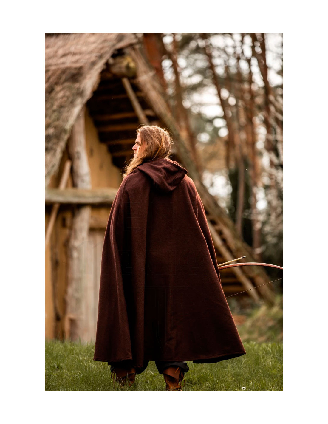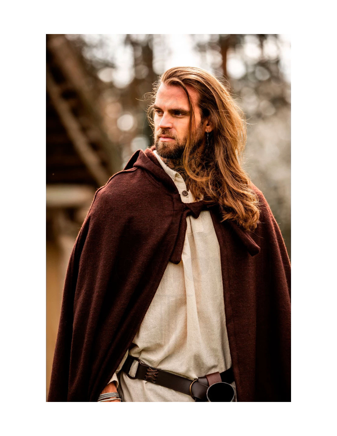 Oplev elegancen og stilen i Elinors klassiske middelalderkappe i mørkebrun! Denne kappe er designet til både mænd og kvinder og har en kort hætte, der tilføjer et unikt og karakteristisk touch.