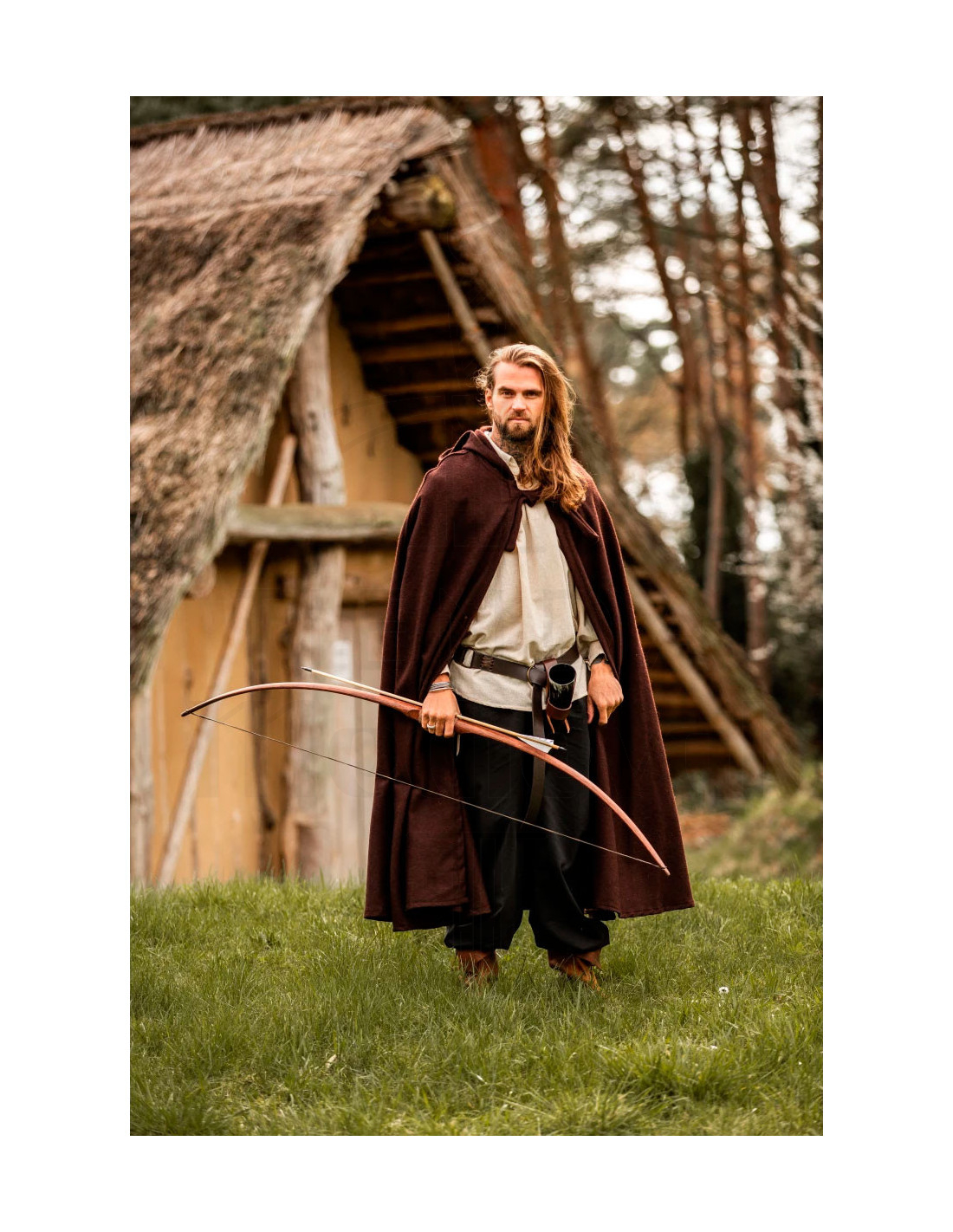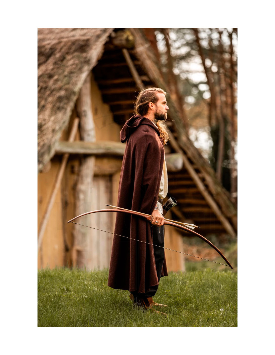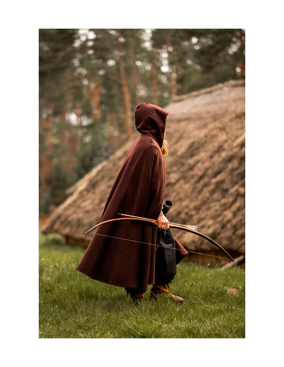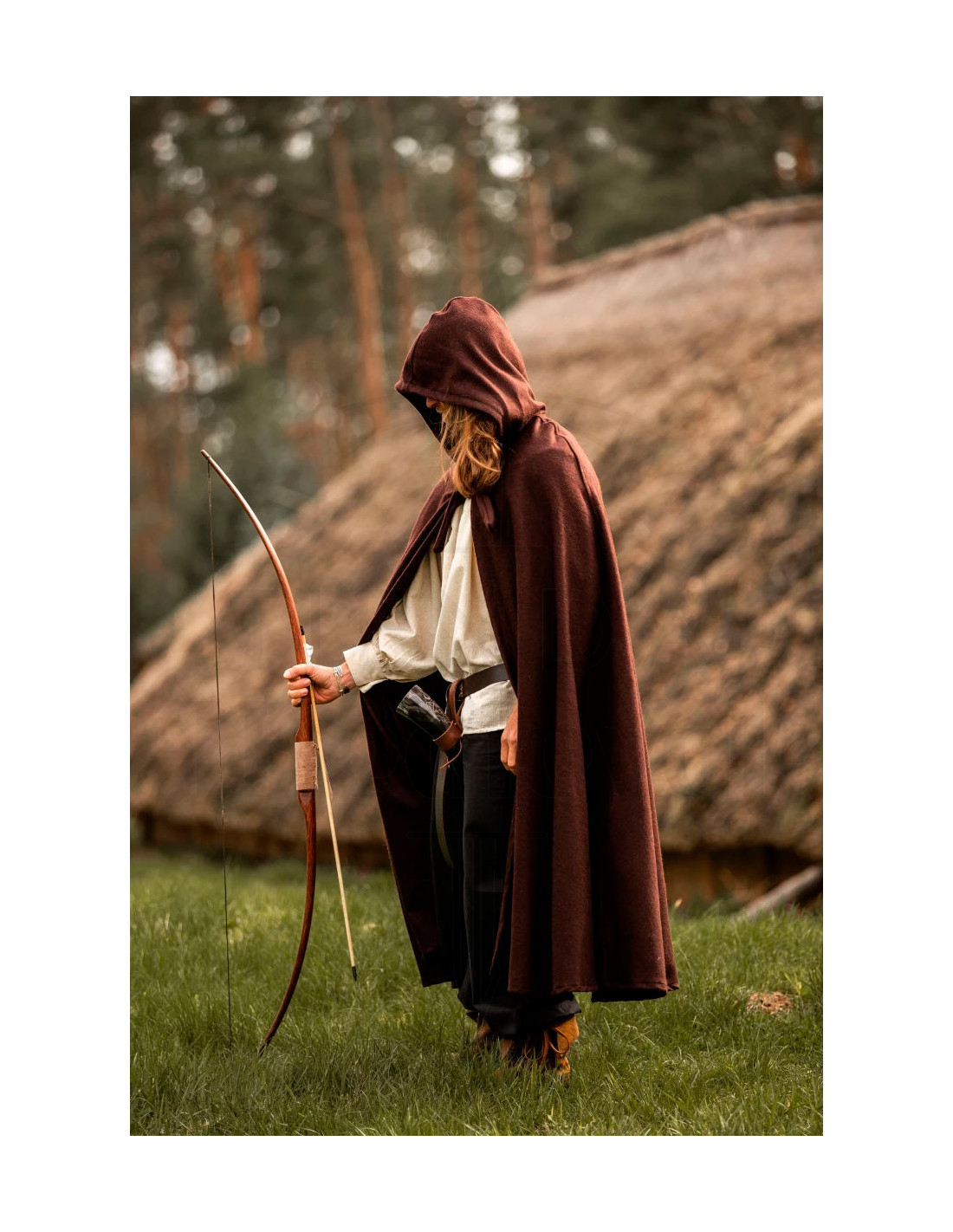 Oplev elegancen og stilen i Elinors klassiske middelalderkappe i mørkebrun! Denne kappe er designet til både mænd og kvinder og har en kort hætte, der tilføjer et unikt og karakteristisk touch.