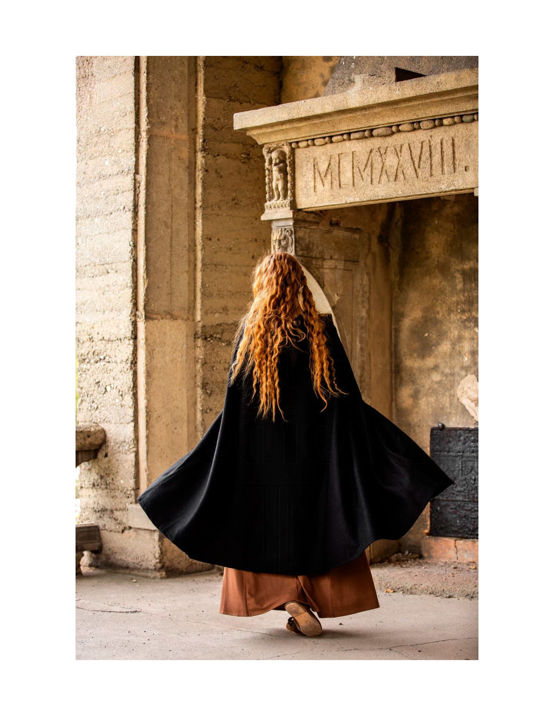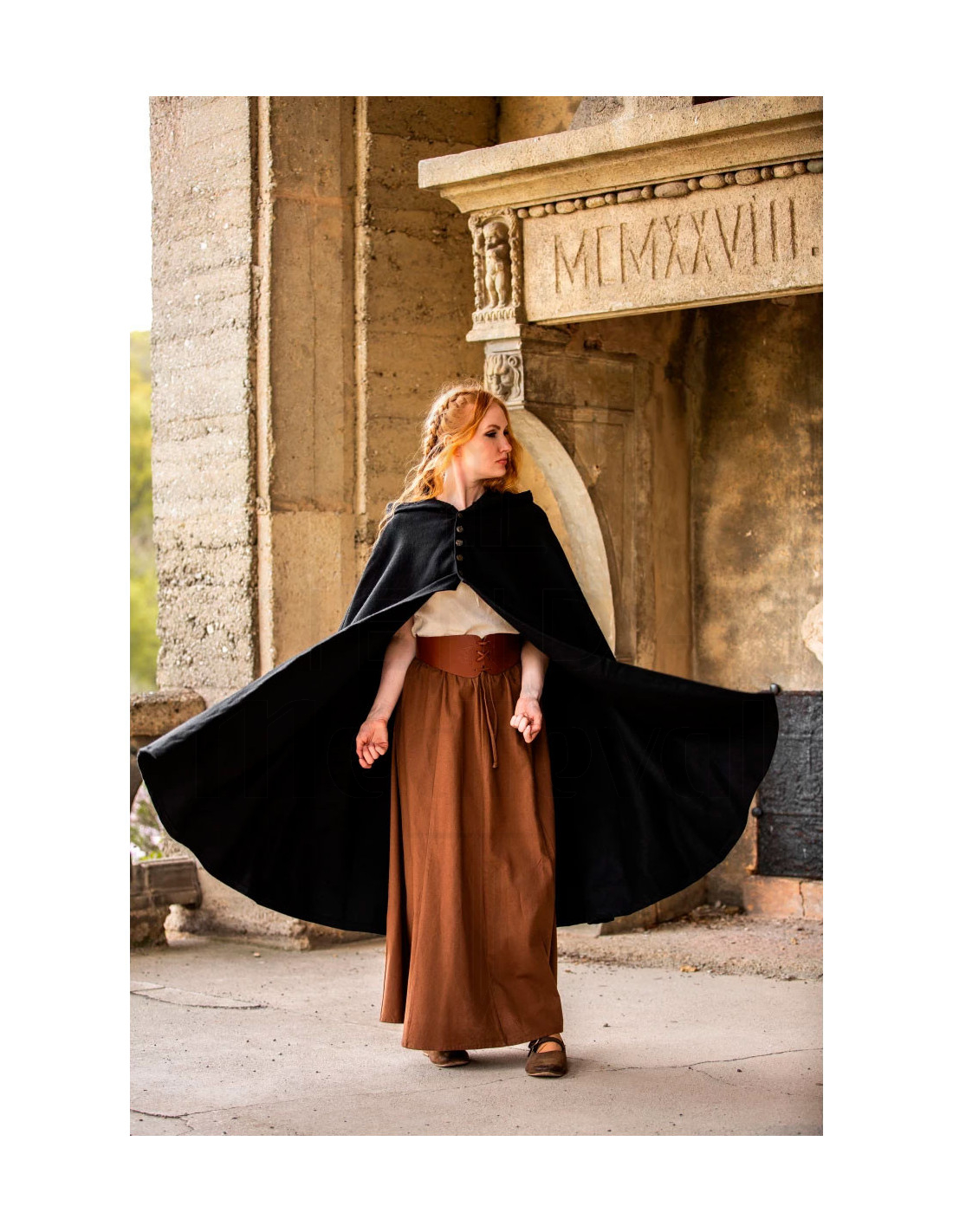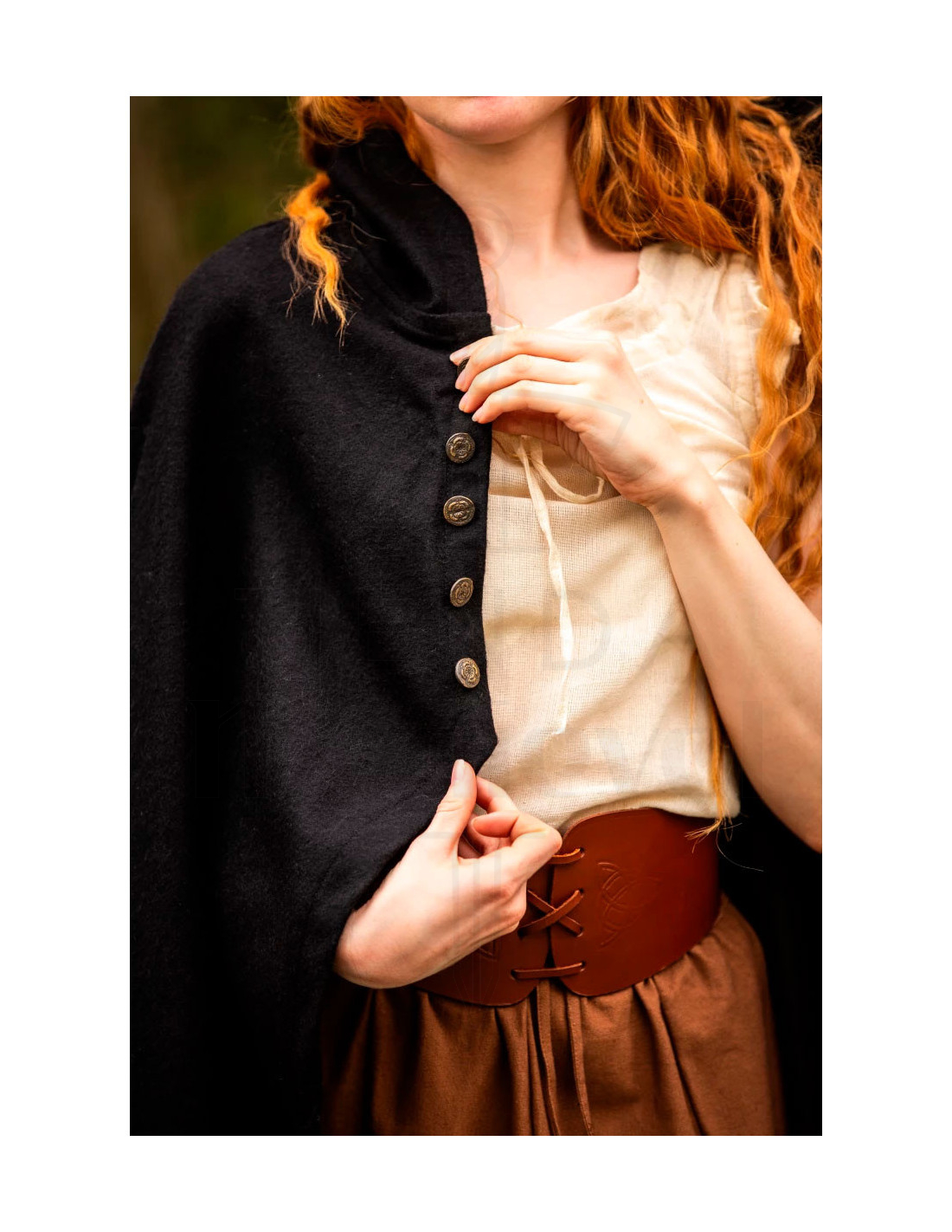 Oplev elegancen og stilen ved Heidi-modellens korte middelalderkappe i sort! Denne kappe er perfekt til at tilføje et strejf af mystik og sofistikering til dine outfits. Med mål på 110 cm i længden og en bredde på 231 cm forsikrer vi dig om, at du hele tiden vil føle dig godt tilpas og varm.