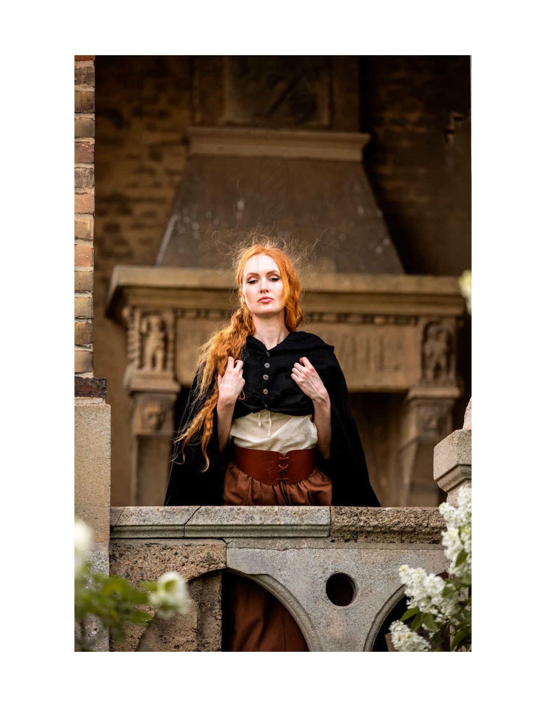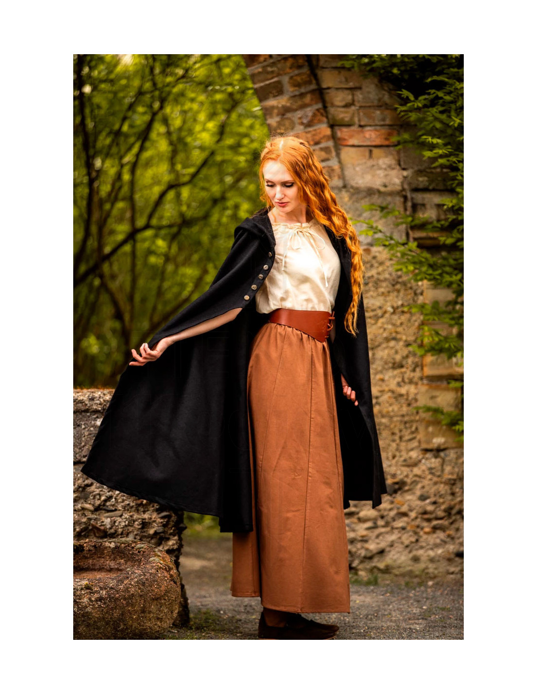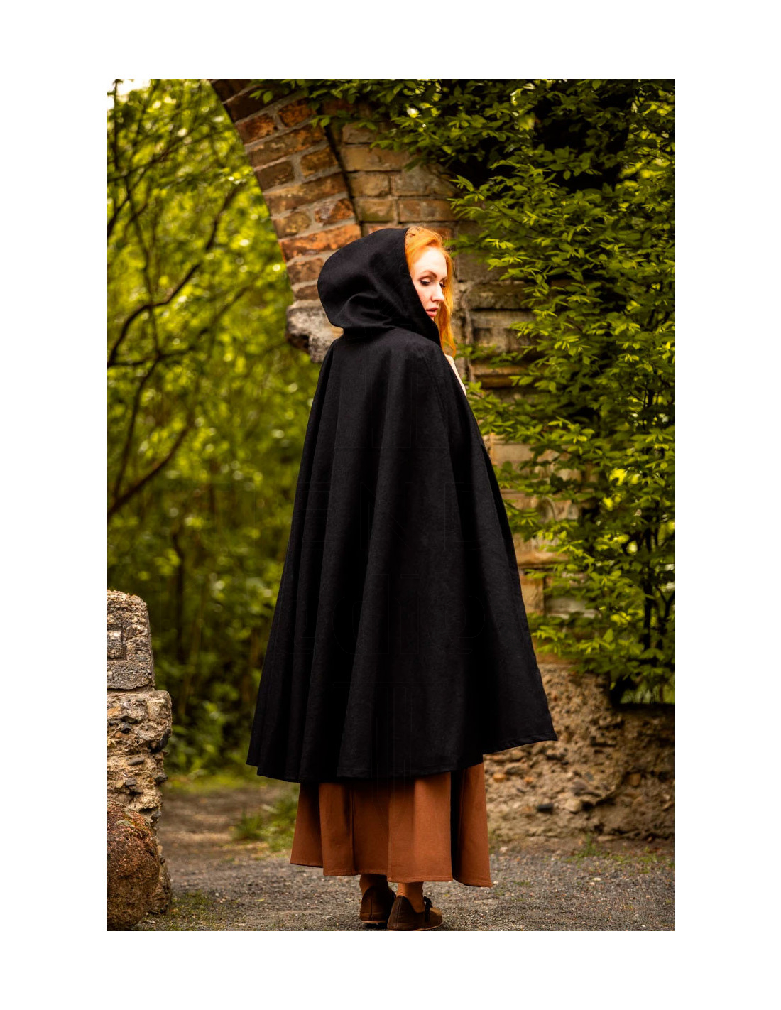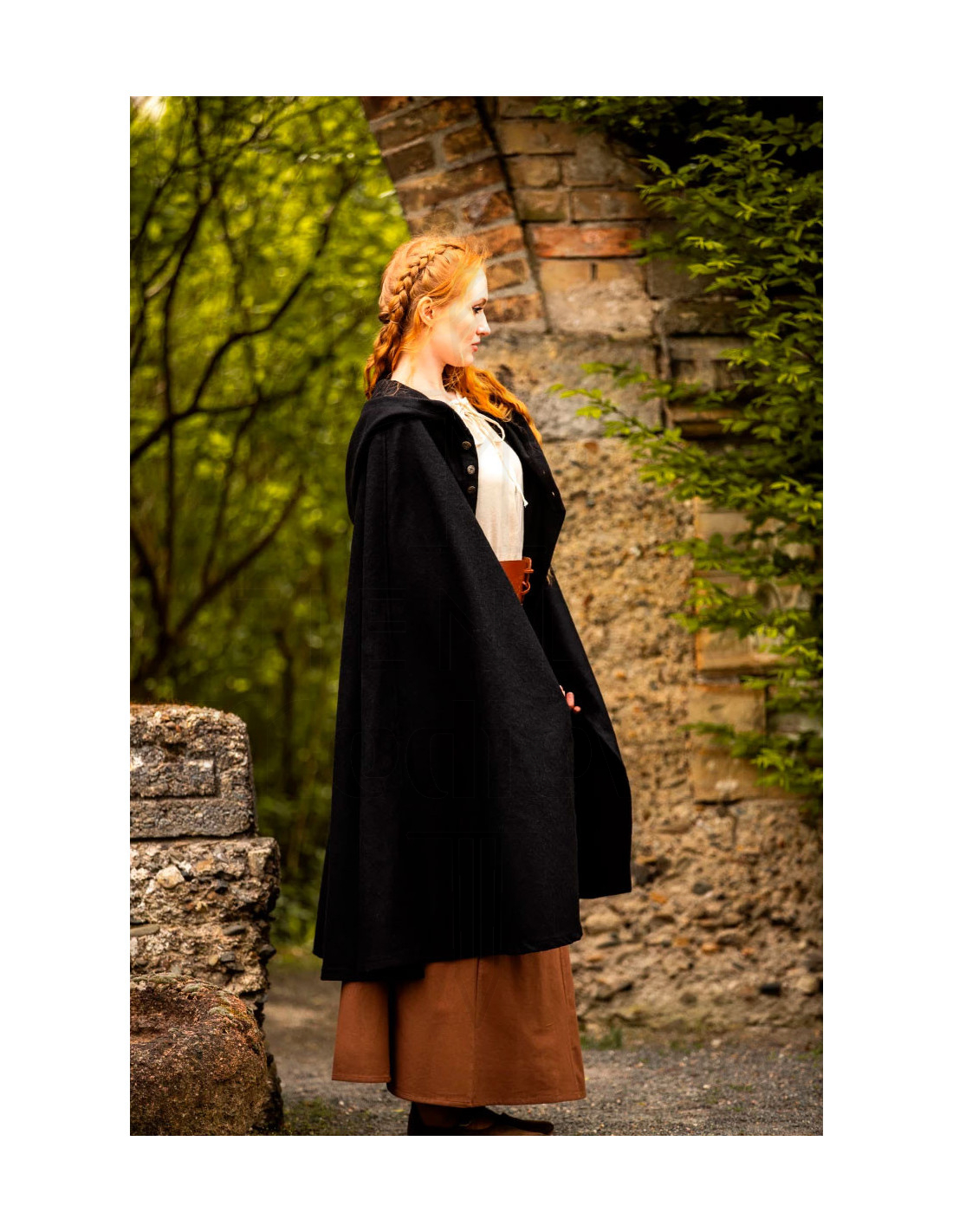 Oplev elegancen og stilen ved Heidi-modellens korte middelalderkappe i sort! Denne kappe er perfekt til at tilføje et strejf af mystik og sofistikering til dine outfits. Med mål på 110 cm i længden og en bredde på 231 cm forsikrer vi dig om, at du hele tiden vil føle dig godt tilpas og varm.