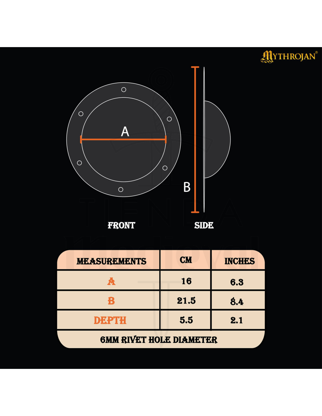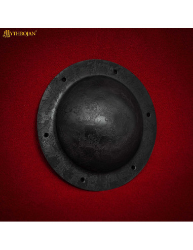 Den antikke sorte finish og den hamrede overflade fremkalder æstetikken fra oldtidens krigere og giver et ægte og karakterfuldt udseende. Den koniske form og den ujævne tekstur tilføjer ikke kun dramatik, men sikrer også effektiv beskyttelse, samtidig med at de styrker skjoldets integritet under kamp eller udstilling.