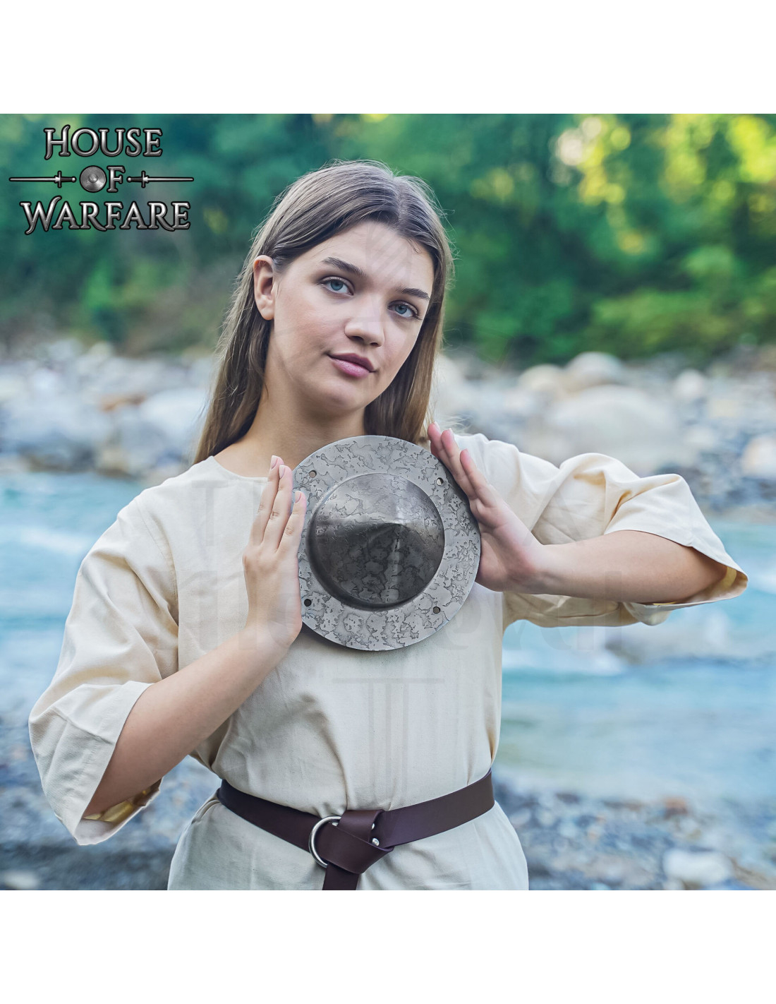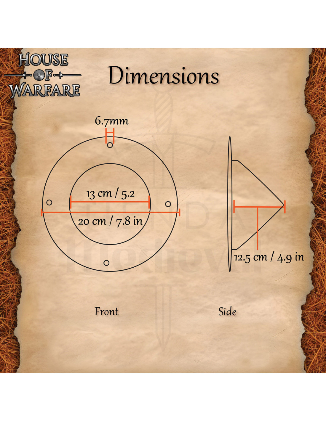 Håndsmidd i kvalitetsstål, viser det tyske middelalder umbo i konisk form en hammeret tekstur, der giver et arbejds- og autentisk udseende, ideelt til dem, der værdsætter visuel detaljer både i vitriner og i reenactments. De ujævne relief af overfladen tilføjer ikke kun tilstedeværelse, men skjuler også de kontinuerlige brugser efterlader en attraktiv finish på stykket.