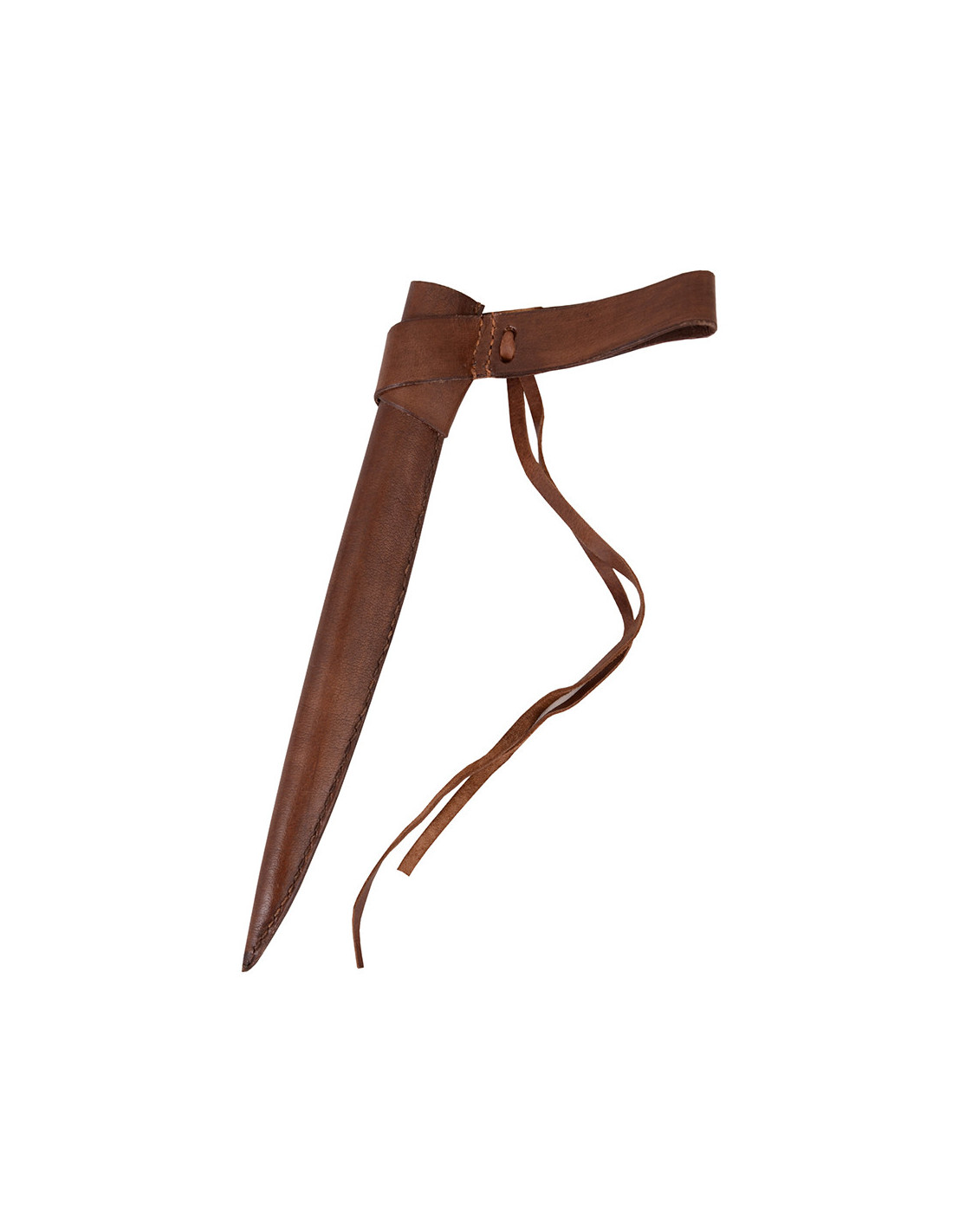 Skæftet på denne dolk er lavet af massivt træ, hvilket giver den et unikt og autentisk udseende. Derudover har den stålbeslag, der fremhæver dens elegance og fasthed. Dens robuste koskindskede, syet med præcision, er det perfekte supplement til at transportere og beskytte denne middelalderlige juvel.