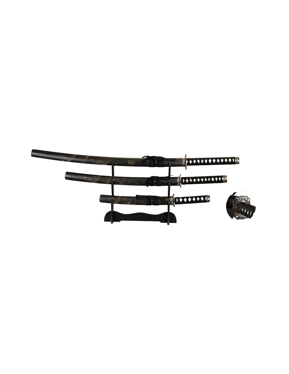 Kunne du tænke dig at have et autentisk stykke japansk kultur i dit hjem? Med sættet med 3 sorte katanaer med et bordstativ vil du være i stand til at nyde elegancen og skønheden ved disse legendariske sværd.