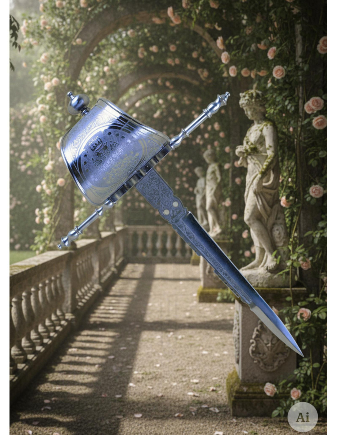 Oplev venstrehåndsdolken med skede, et enestående stykke for samlere! Denne dolk er blevet håndlavet i Toledo, Spanien, med omhyggelig opmærksomhed på detaljer. Dens graverede stålklinge og skål giver den et unikt og elegant udseende.
