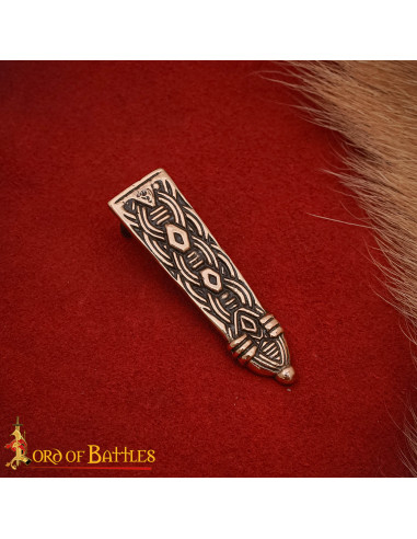 Inspireret af nordiske fund fra vikingetiden, tilfører denne spids den autenticitet, der adskiller et rekreativt outfit fra en simpel imitation. Den antik bronzefinish og de sorte detaljer fremhæver reliefet og giver dybde til sammenflettede knuder og geometriske romber, så motivet er tydeligt fra alle vinkler.