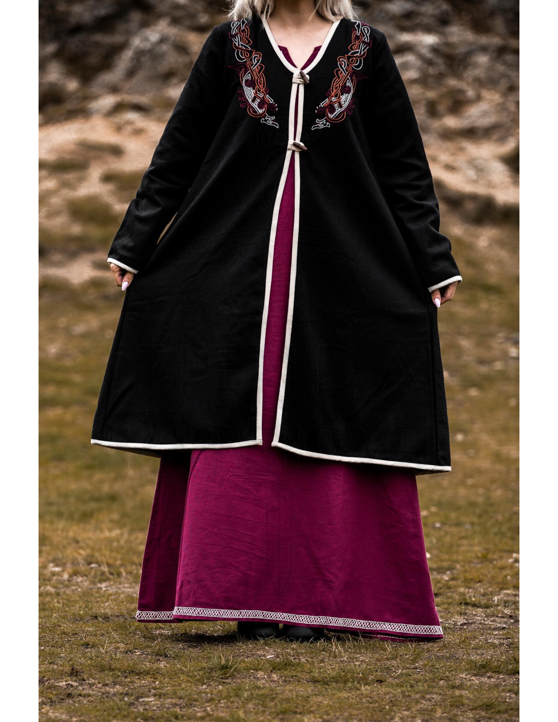 Den forreste lukning med træknapper tilføjer en varm og nem betjening, designet til hurtigt at justere tøjet. Den kontrasterende kant og broderierne på brystet, inspireret af Urnes-stilen, tilføjer en kunstnerisk detalje, der fremhæver ethvert sæt og understreger forbindelsen til forhistoriske traditioner, uden at være overdrevet.