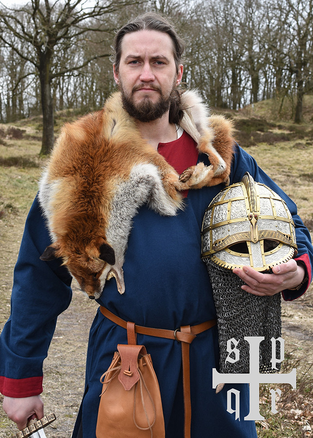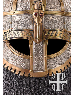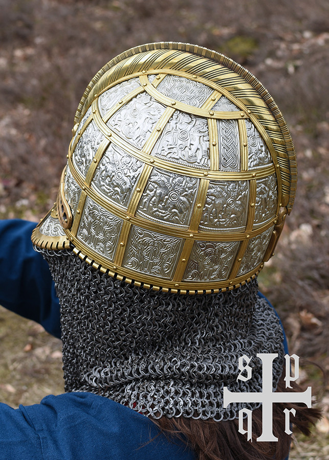 Denne replika er lavet af 2 mm stål og udstyret med en ringbrynje bestående af flade nittede ringe med en indvendig diameter på 8 mm. Pladerne er lavet af tyndere stål (pressede plader) og fastgøres til skroget med messingremme/bånd. Kammen og øjenbrynene er også lavet af messing. De indviklede mønstre er nøjagtige gengivelser af de originale motiver. Den tidlige middelalderlige brillehjelm leveres komplet med et justerbart læderfor og hagerem.