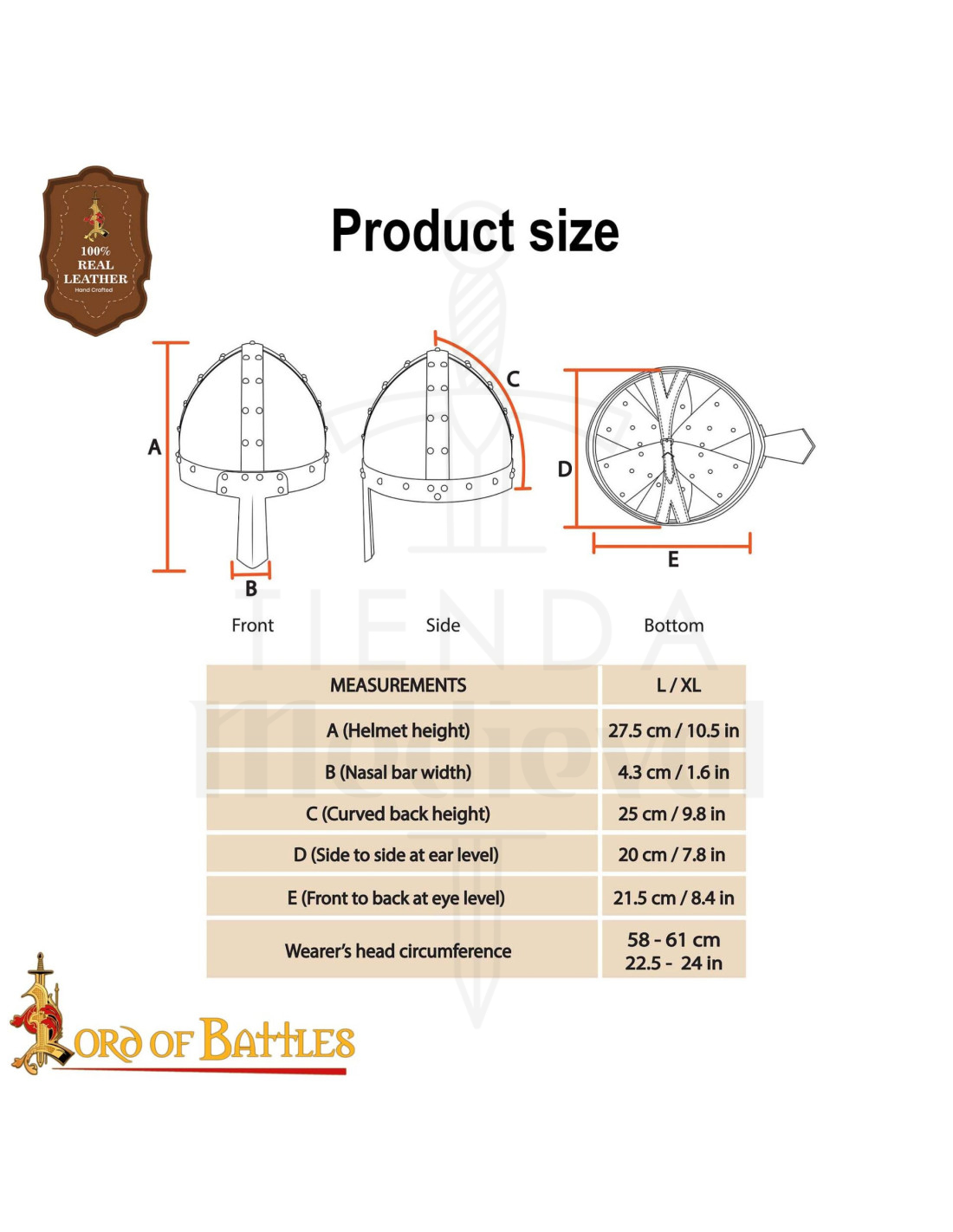 Med en vægt på ca. 2,5 kg er denne hjelm robust, men håndterbar, ideel til cosplay, historisk rekonstruktion eller samling. Inspireret af den normanniske erobringsperiode i det 11. århundrede, gør den sølvfinish og nagledetaljerne til et autentisk stykke, der skiller sig ud i enhver udstilling. Desuden sikrer mærket 'Lord of Battles' kvalitet og historisk troværdighed.