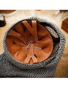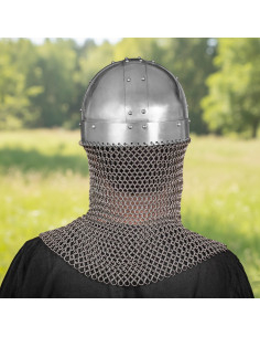 - Kombineret Beskyttelse: Denne vikingehjelm, kombineret med en skjold af kød af 16 calibre, giver et robust forsvar. Koten er lavet af 16 gauge stål og sikrer en ekstra barriere omkring hjelmen, og tilbyder udvidet beskyttelse.