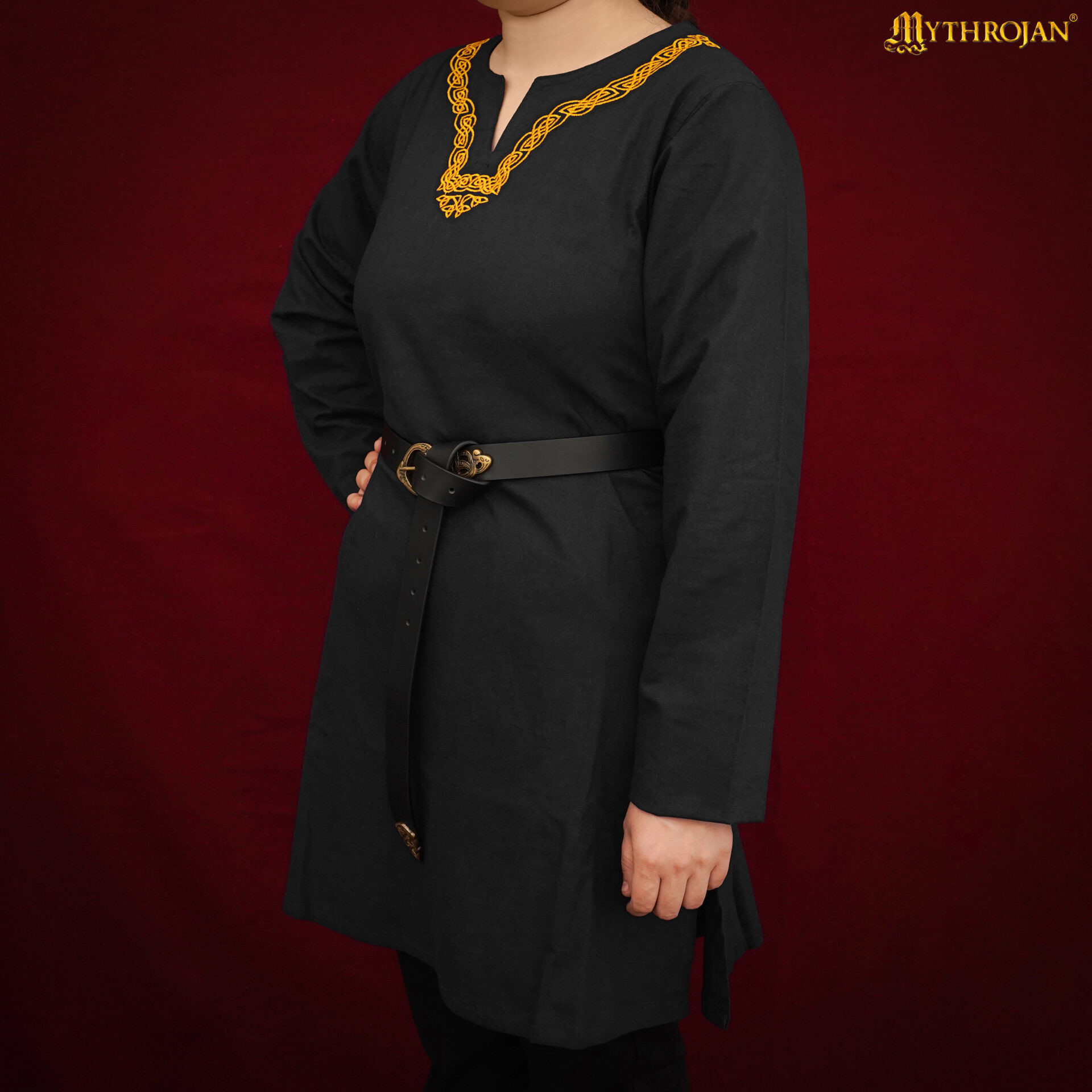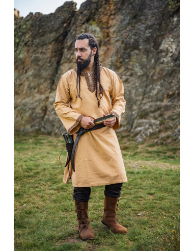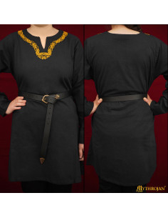 Dens design har en detaljeret broderi i nakken med nordiske knudemønstre i guld, hvilket tilføjer et strejf af autenticitet og ældgammel symbolik. Tunikaen, med en løs pasform, har åbninger i siderne og en rund hals med en lille 'V'-formet åbning, hvilket letter bevægelse og refererer til traditionelle beklædningsstile. Den inkluderer et sort læderbælte med dekorativ spænde, som fremhæver dens historiske karakter og giver mulighed for at justere tøjet til din figur for et komplet og elegant look.
