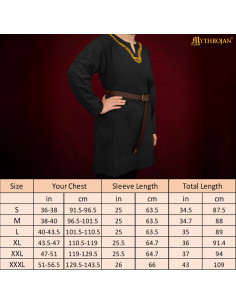 Vil du se ud som en ægte vikingekriger eller en middelalderlig noble? Denne vikingetunika i sort bomuld kombinerer stil og komfort i et stykke, der forvandler ethvert outfit til en historie- og fantasideklaration. Fremstillet i let bomuld, lader den dig se frisk og komfortabel ud hele dagen, perfekt til festivaler, reenactments eller dine egne eventyr i den middelalderlige verden.