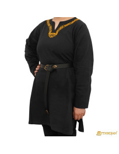 Vikingetunika i bomuld med lange ærmer, broderet krave, sort farve