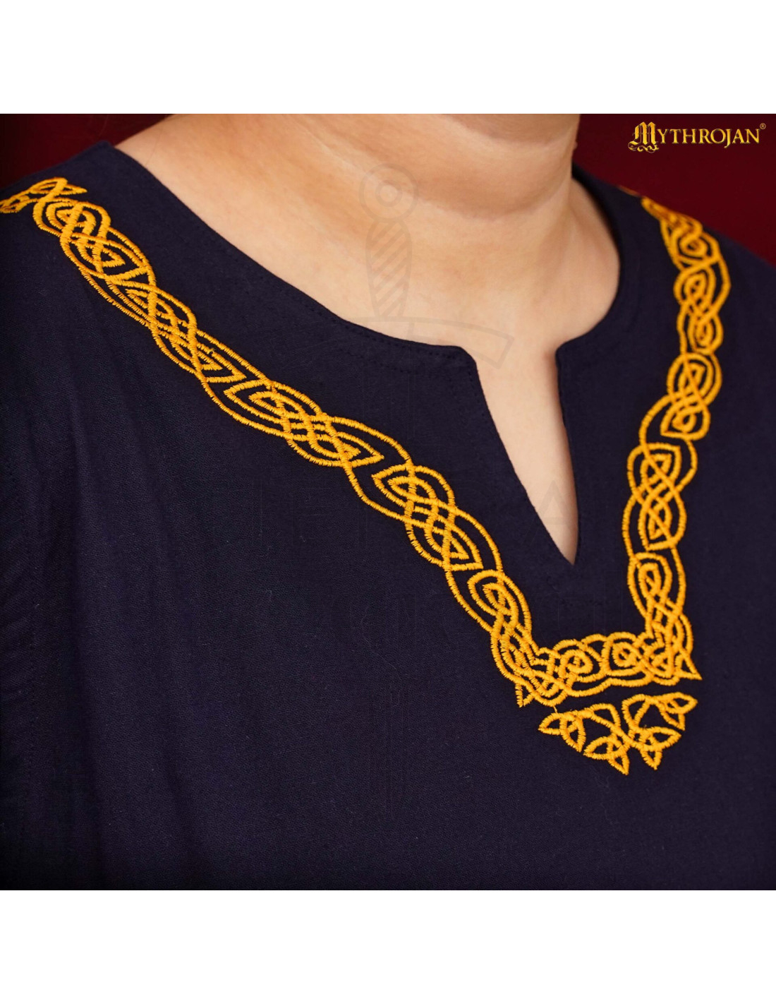 Det karakteristiske præg kommer fra det nordiske knudearbejde broderet i halsen, med gyldne mønstre, der tilføjer et strejf af symbolik og elegance til vikingelooket. Det løse design med sideåbninger giver fri bevægelighed, uanset om du kæmper, danser eller stolt poserer i dit kostume.