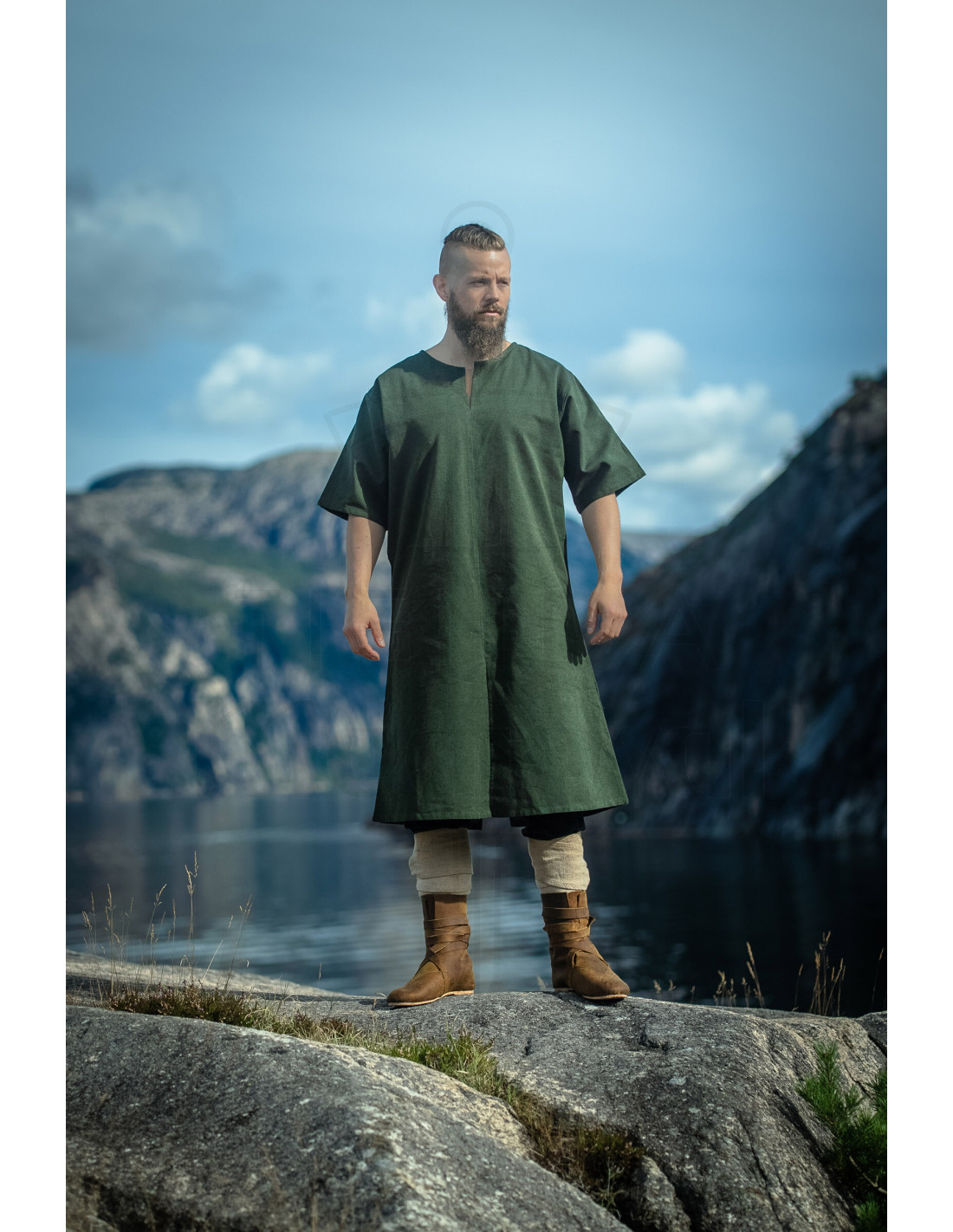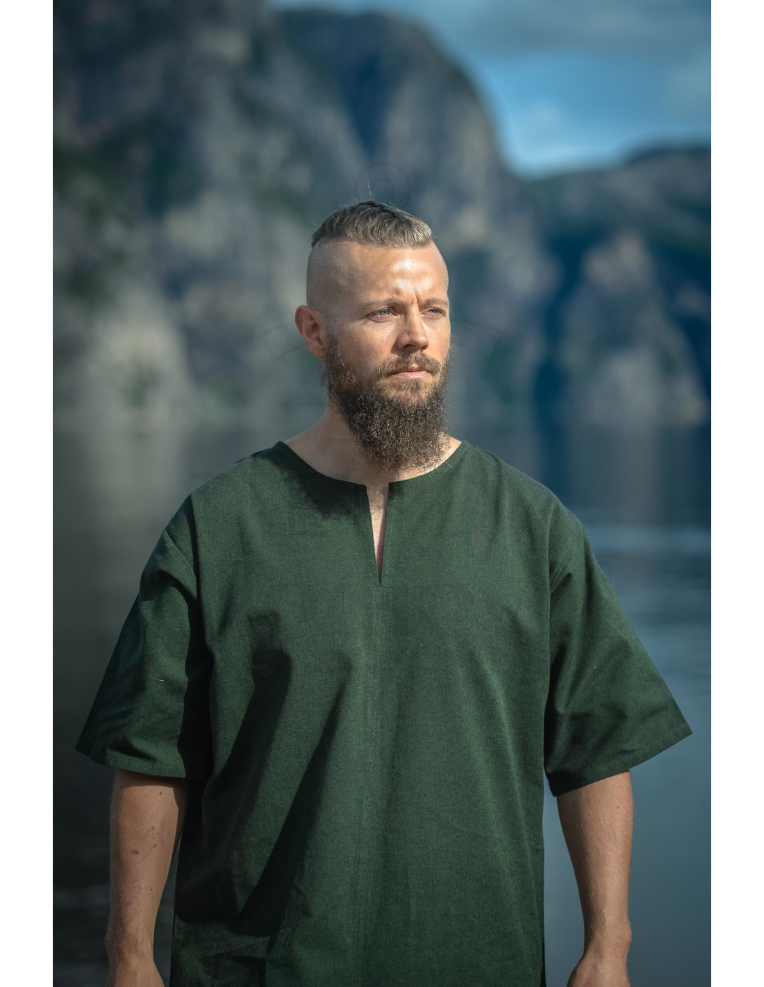Vikingeskjorte til mænd Asgrim med V-hals, Grøn tilbyder den perfekte blanding af historisk karakter og moderne komfort, designet til at du kan bevæge dig frit og med stil. Den V-formede hals gør det let at tage den på og af hurtigt, mens det afslappede snit giver dig mulighed for at være smidig i enhver aktivitet, fra reenactments til daglige gåture.