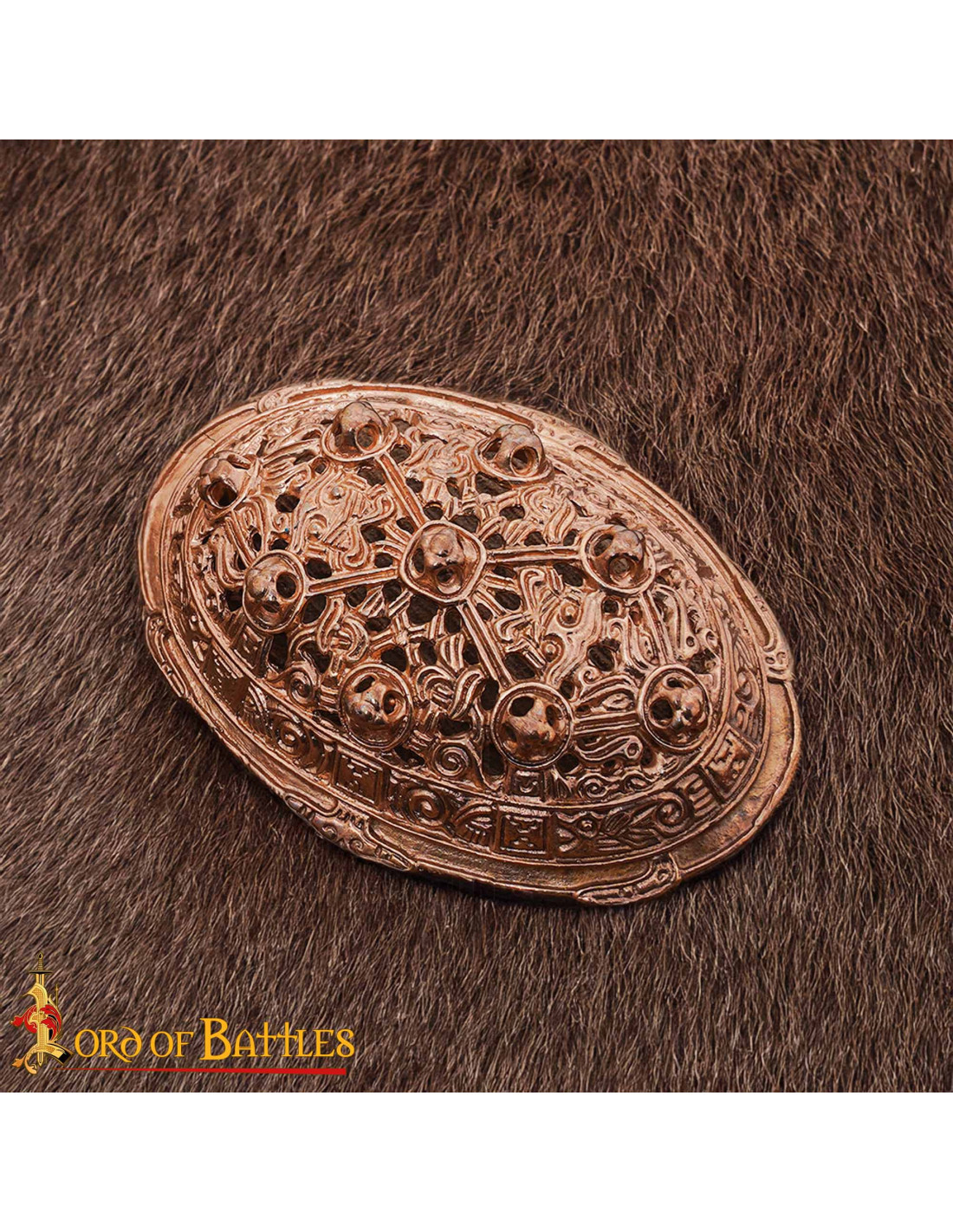Hvis du ønsker at tilføje et autentisk og historisk præg til dine beklædningsgenstande eller samlinger, er dette oval vikingekrog i bronze det perfekte stykke. Inspireret af en fund fra det 9. århundrede, har dets detaljerede design en forhøjet midte dekoreret med indviklede knudemønstre og perledetaljer, hvilket afspejler det håndværksmæssige mesterskab fra vikingetiden.