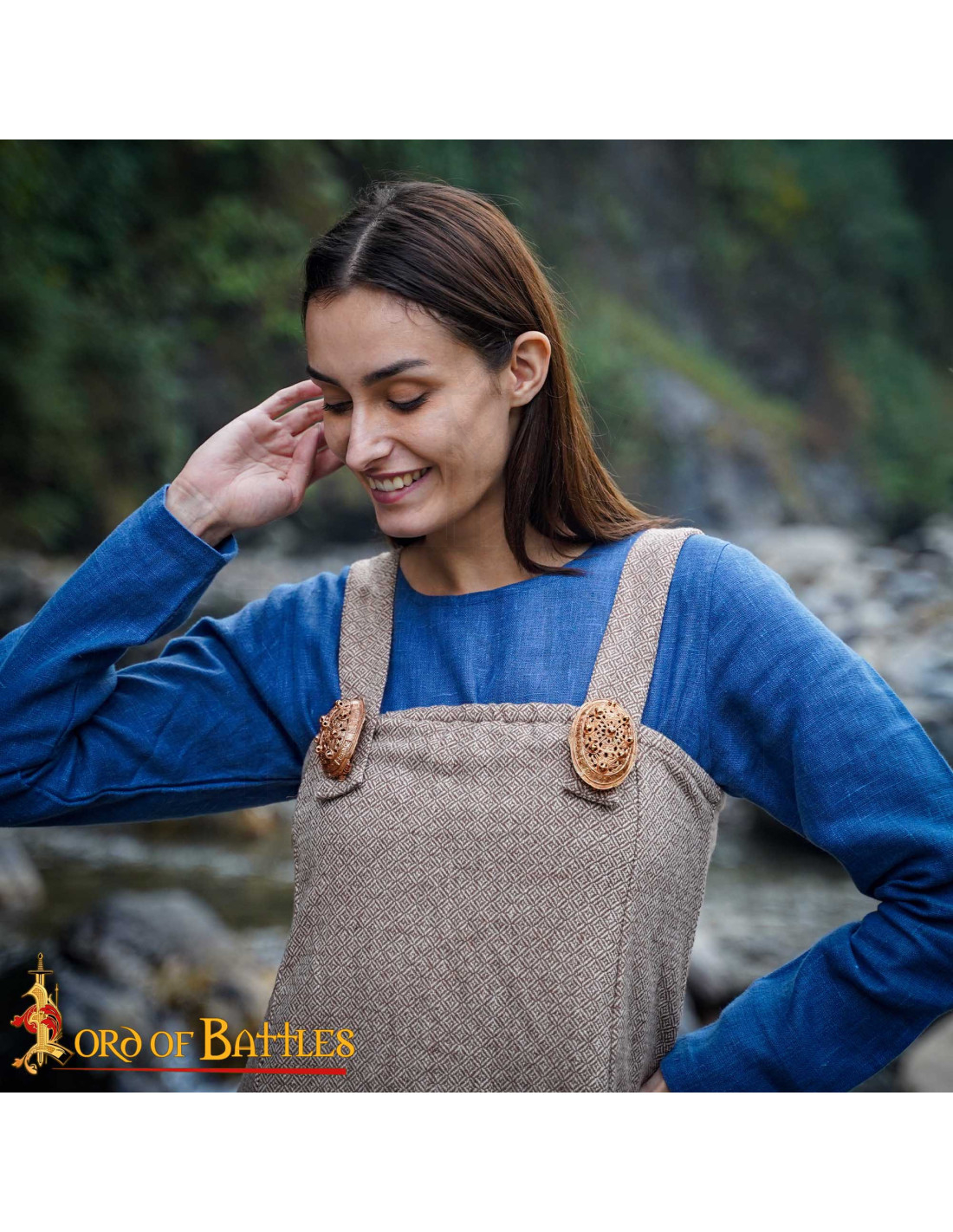 Traditionelt brugt i par til at holde skulderstropper på kjoler, fremkalder dette tilbehør stilen, som vikingekvinder ofte bar, ofte pyntet med dekorative kæder eller supplerende brocher.
