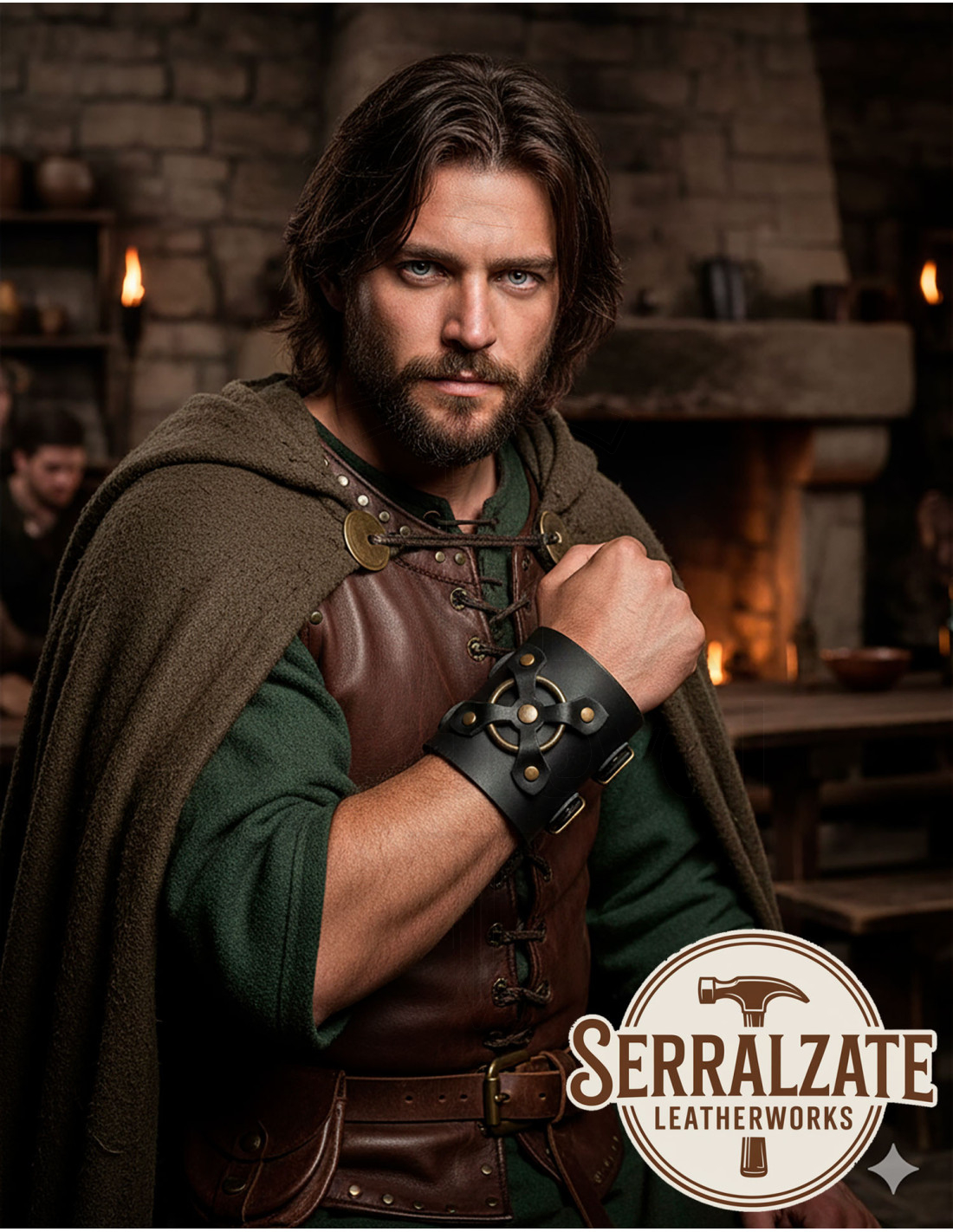 Entdecken Sie das mittelalterliche Armband Alejandro in Schwarz von Serralzate LeatherWorks, ein Accessoire, das das Gewöhnliche übertrifft. Dieses elegante Schmuckstück ist nicht nur als Schmuckstück konzipiert, sondern auch als ein markantes Element für Ihre Rüstung, ideal für diejenigen, die das Abenteuer in jedem Moment leben.