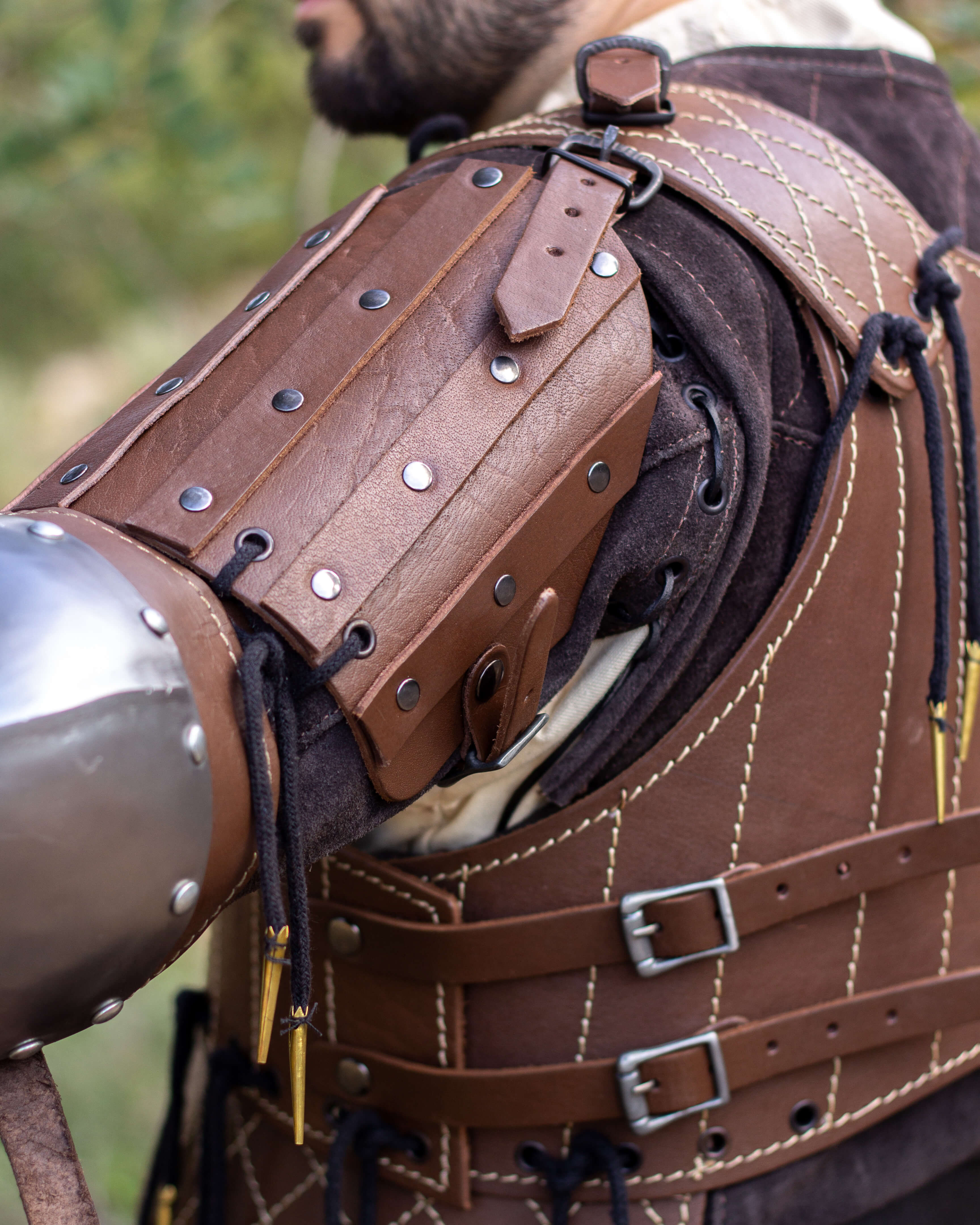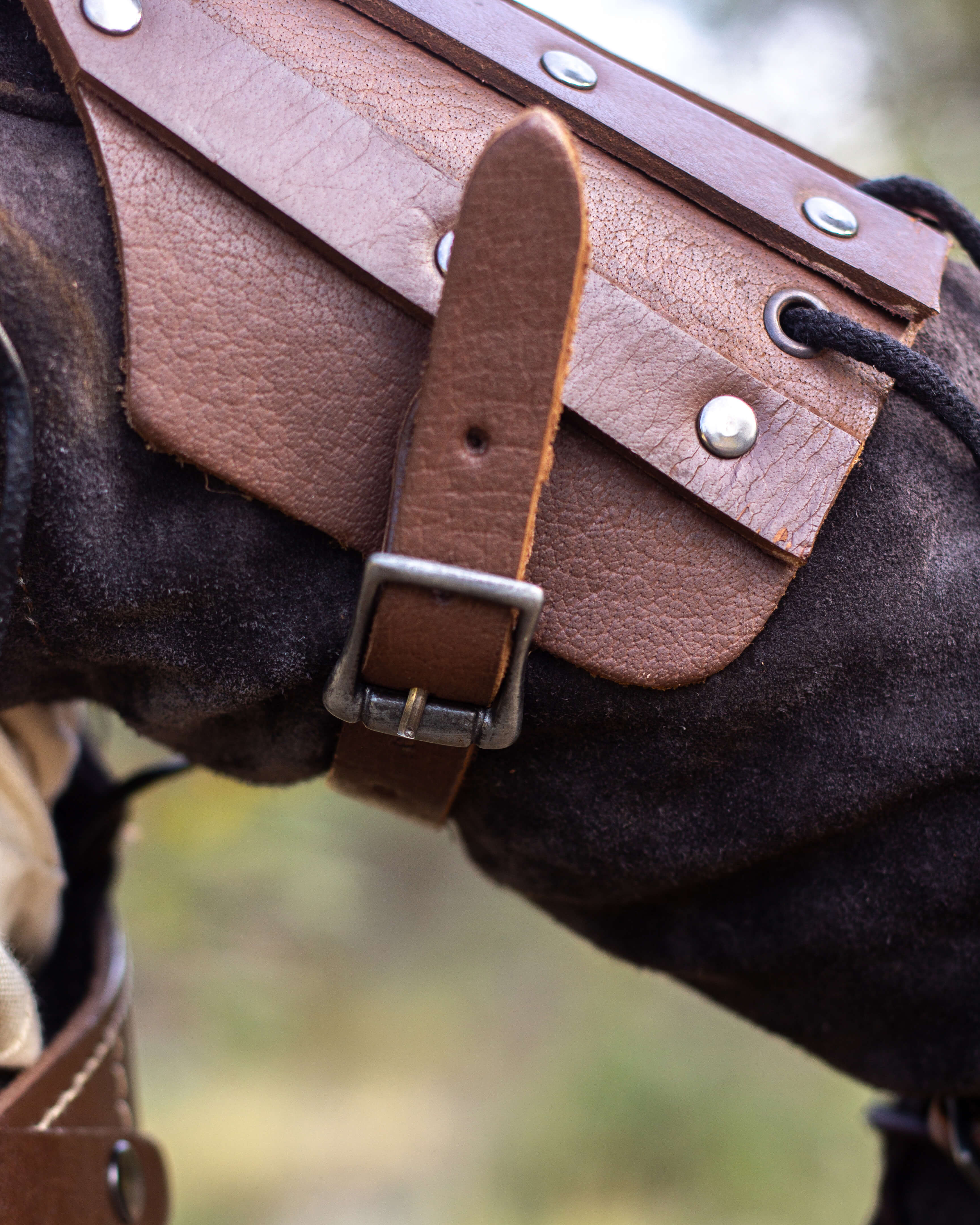 Das Design mit überlappten Riemen und dunklen Nieten schafft nicht nur eine handwerkliche und kräftige Ästhetik, sondern verteilt auch die Spannung, sodass der Armschutz sich der natürlichen Geste des Unterarms anpasst, und Freiheit beim Greifen, Klettern oder Manövrieren mit Vertrauen ermöglicht. Die konische und leicht gebogene Form umschließt die Anatomie und bietet stabilen Halt ohne steifes Gefühl.