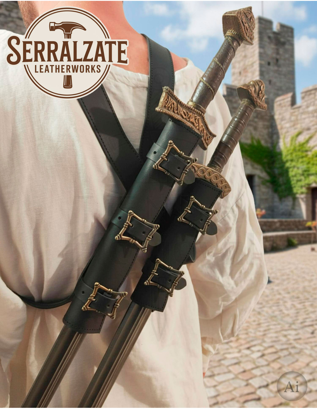 Entdecke das **Doppel-Klingenholster mit Gürtel für LARP** von Serralzate LeatherWorks, ein handwerkliches Meisterwerk, das speziell für diejenigen entworfen wurde, die Qualität, Funktionalität und Stil suchen. Hergestellt aus robustem Leder und mit Metallbeschlägen in antik-bronzefarbenem Finish, ist dieses Gurtsystem der perfekte Begleiter für deine Live-Abenteuer. Sein symmetrisches Design ermöglicht es, bequem zwei Schwerter zu tragen, jedes in seiner eigenen Scheide, und bietet dir schnellen und sicheren Zugriff während der Events.