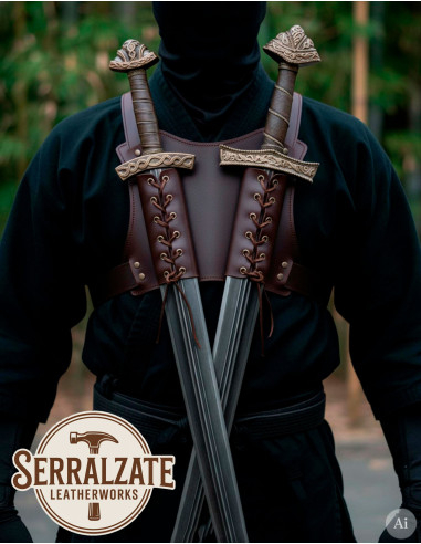 Möchten Sie Ihre Schwerter mit der Sicherheit und dem Stil eines echten Praktizierenden tragen, ohne auf Komfort zu verzichten? Dieser Tahalí macht es Ihnen leicht, sich frei zu bewegen, die Klingen fest an ihrem Platz zu halten und sofort darauf zuzugreifen.